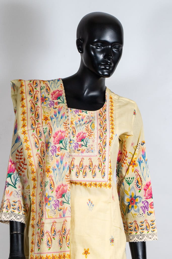 | Fabric Name | Lemon Color Cotton Print with Embroidered Shirt with Cotton Printed Palazzo and Cotton Printed Dupatta |