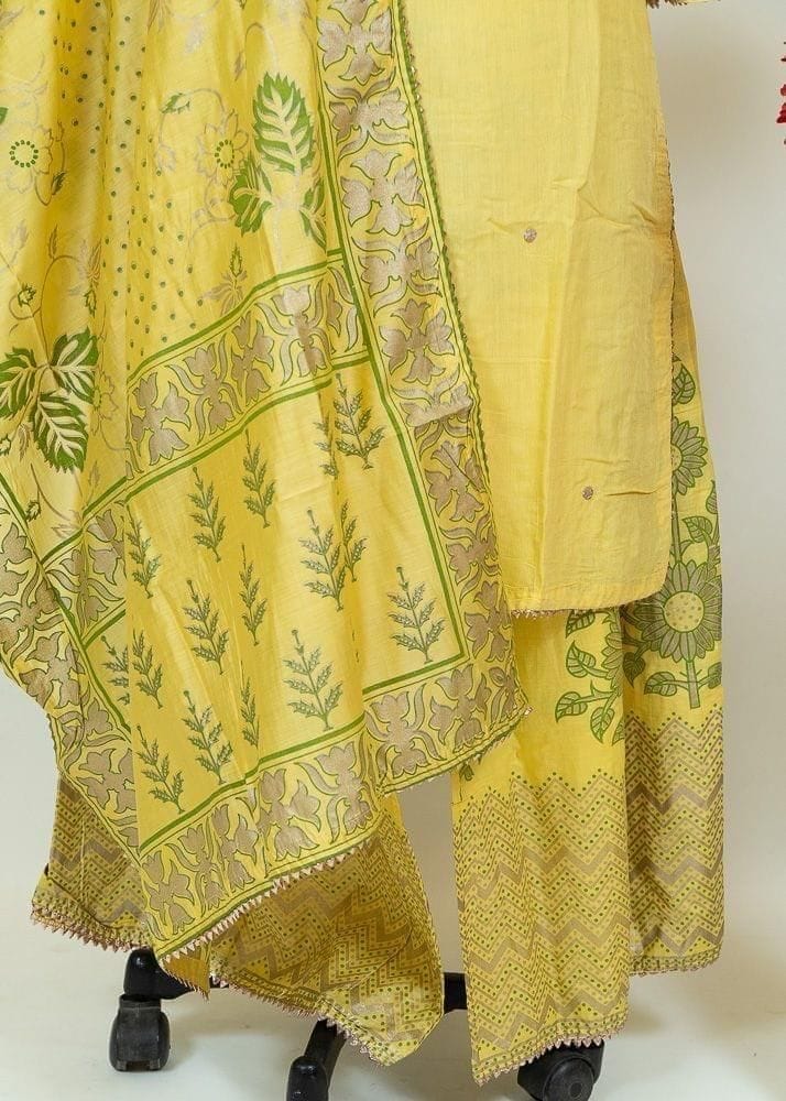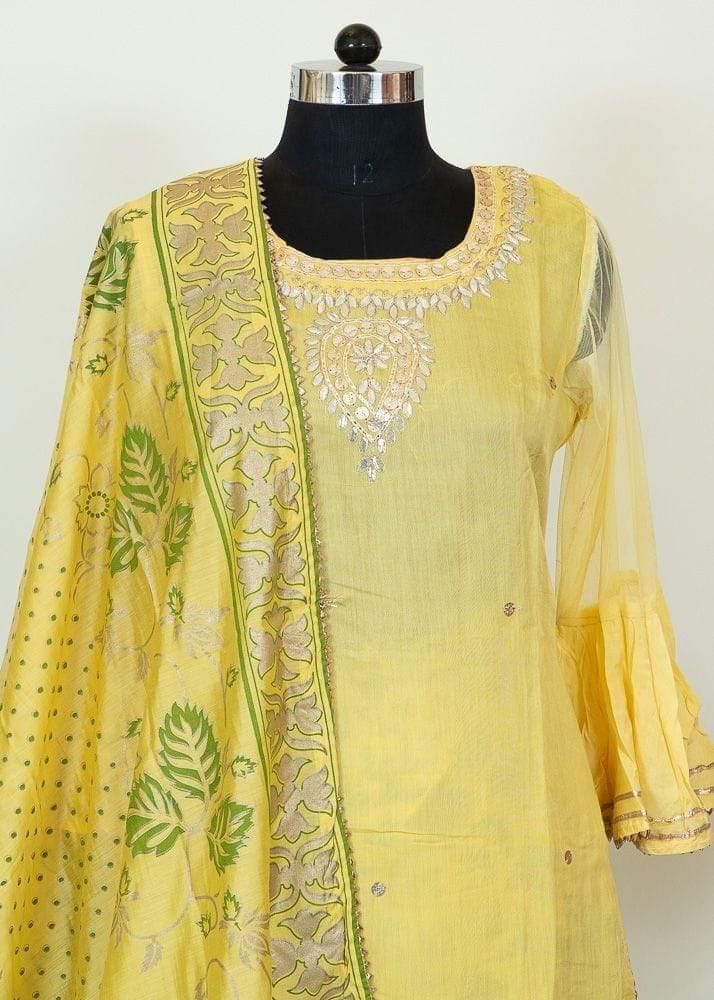 Beauty at its best. The lemon yellow colour suit set with green toned motifs is a classic combination apt for all the upcoming festivities. The sheer sleeves have elaborated bell ends embellished with silver lace. The Gotta-Patti work on neckline looks elegant. The dramatically flared sharara lower has an edgy floral design. The printed chanderi dupatta is all about abstract patterns running across the length. The lightweight and durable Giving a modern touch to the ethnic outfit, the statement piece is sure attract so many compliments. SKU: 100196446