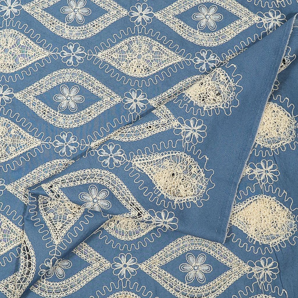 Denim cutwork embroidered fabric features intricate designs cut into sturdy denim, showcasing a blend of texture and artistry. The detailed embroidery enhances the visual appeal, creating a striking contrast against the denim base. Ideal for fashion-forward garments like tops and skirts, this fabric adds a unique, handcrafted touch to any outfit.SKU:100244173