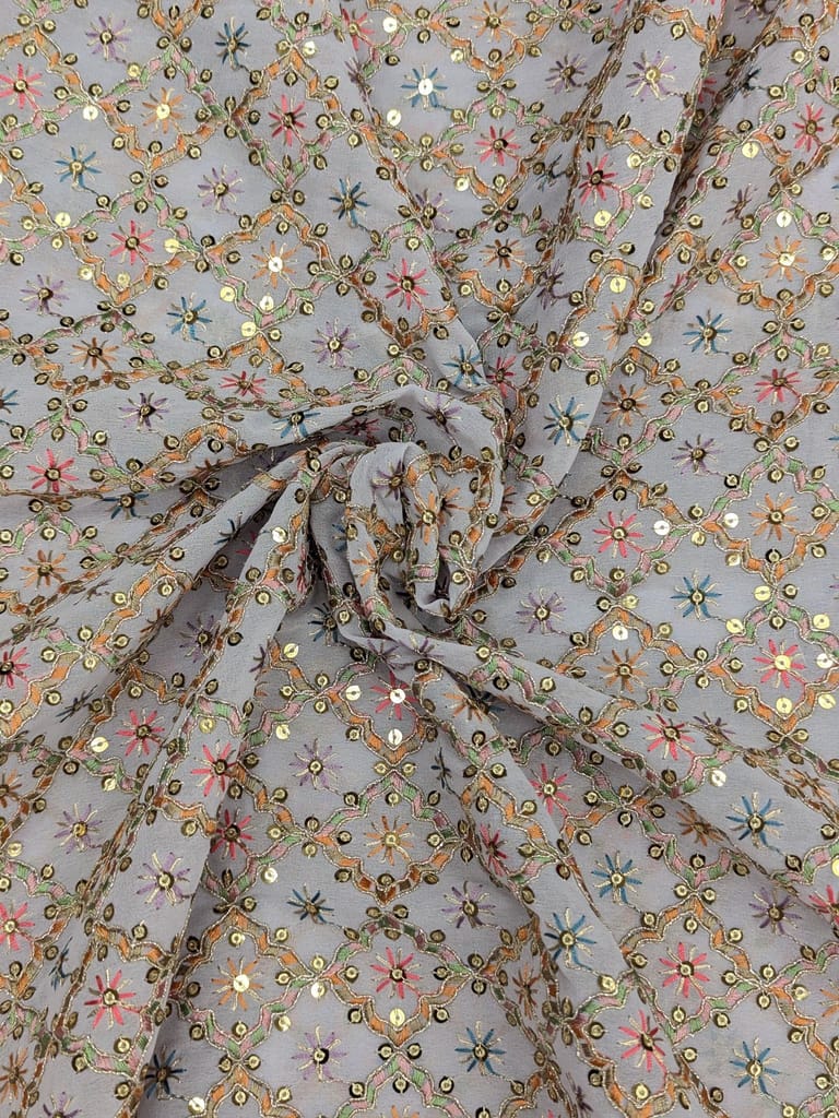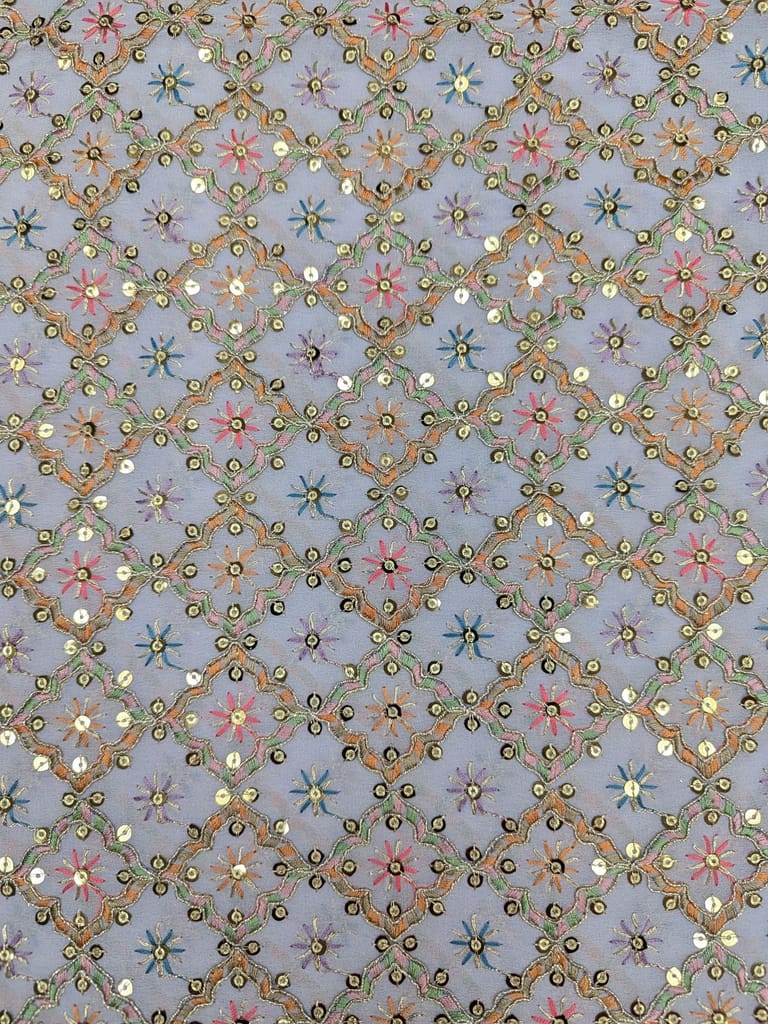 This Light purple georgette fabric has an intricate pattern of embroidery and sequins. The design forms a geometric , trellis -like motif across the surface , with small floral elements in the intersections and centers of the diamond shapes. it incorporates shades of pink , orange , blue , and purple in stitching. The gold-toned sequins adds a sparkling texture and enhances the overall appeal of the fabric.
