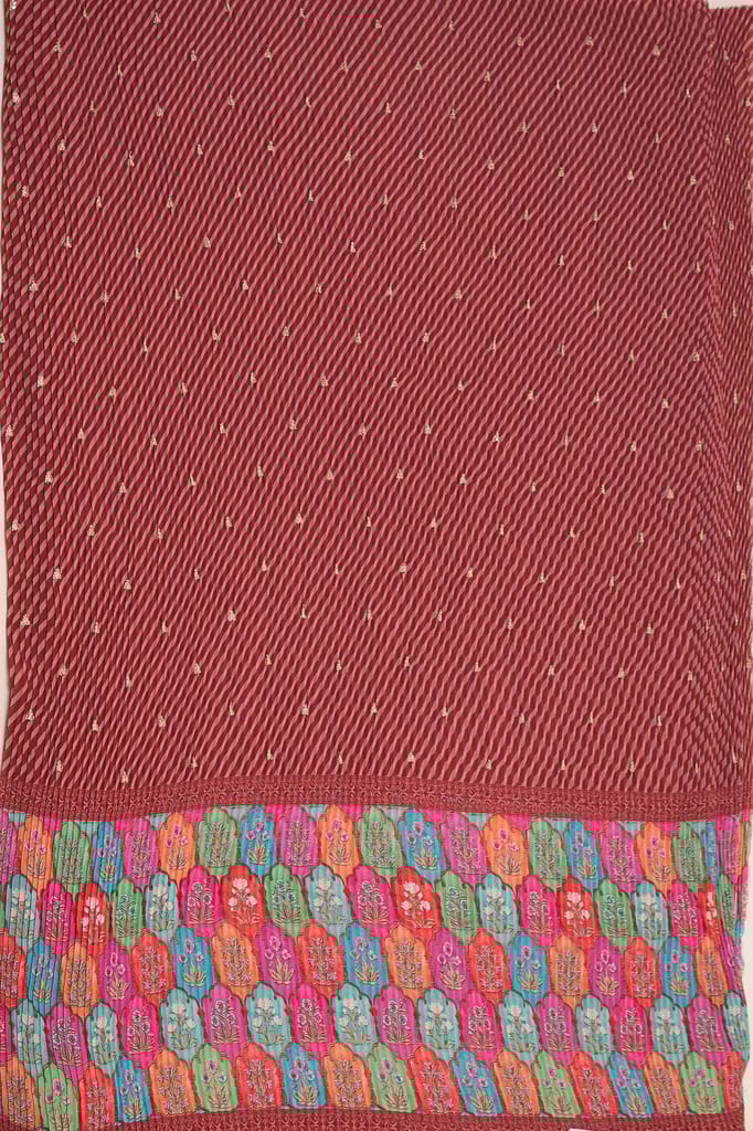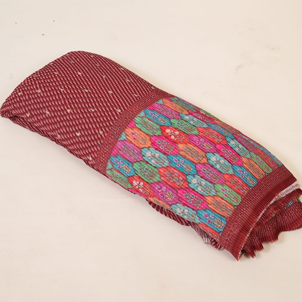 The house of Fabcouture presents a collection of royal fabrics. The pleated georgette fabric looks royal with a timeless combination of Firozi and majenta border. The intricately made floral motifs in a golden shade is the icing on the top. The airy fabric is easy to carry with gliding on the skin like butter. Cool and soothing print runs across the fabric length. Add this affordable fabric of premium quality to your collection to amp up your style quotient. SKU:100231555B