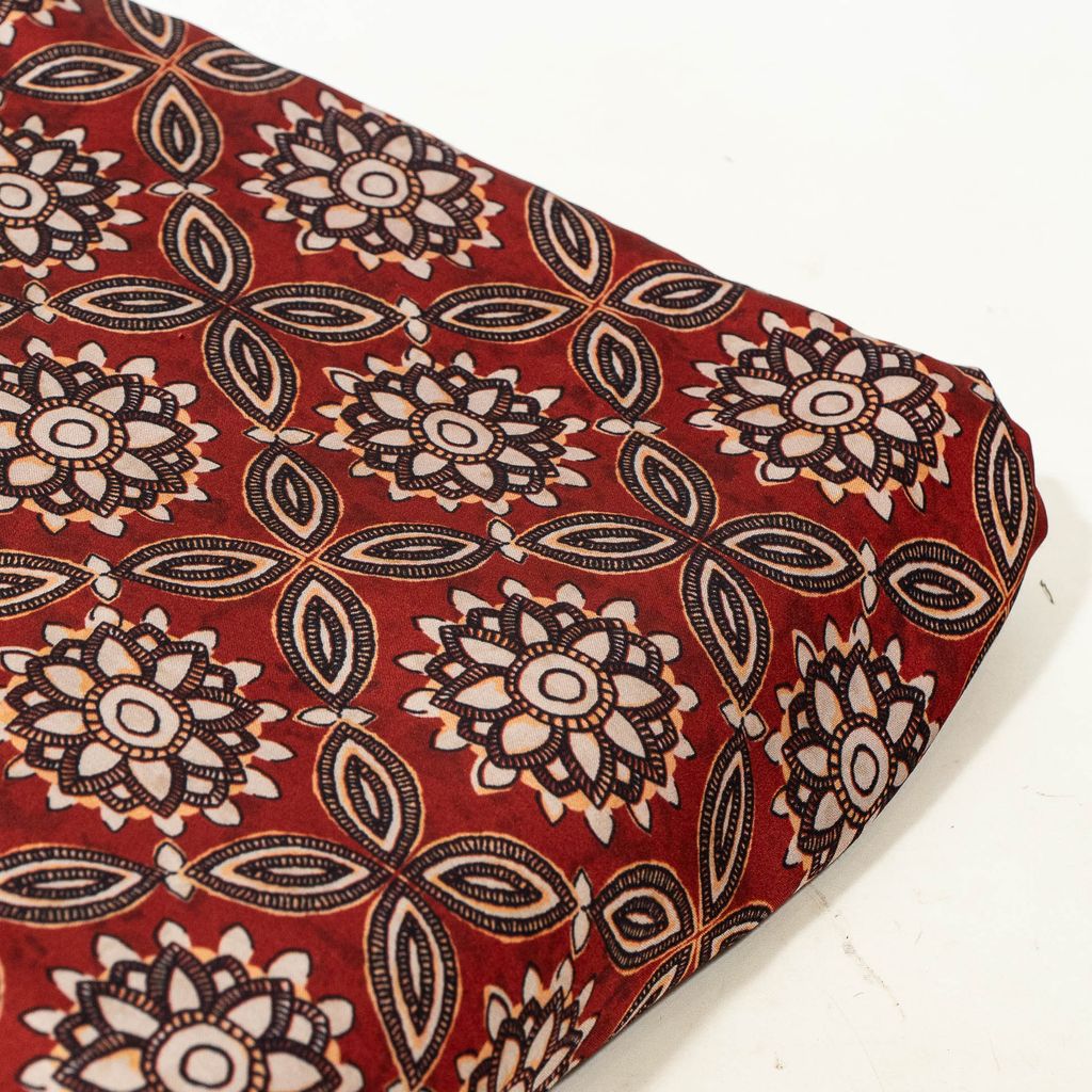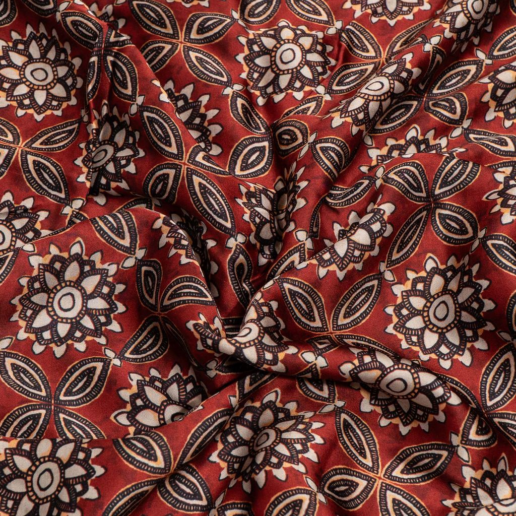 Crafted from smooth 100 GSM modal satin with a 44-inch width, this fabric offers a luxurious feel with a soft, silky touch and elegant sheen. The satin weave enhances the depth of color, while the high-definition digital printing captures the fine detailing of the Ajrakh-style motifs with exceptional clarity. Its fluid drape and premium finish make it ideal for both contemporary and ethnic designer garments.