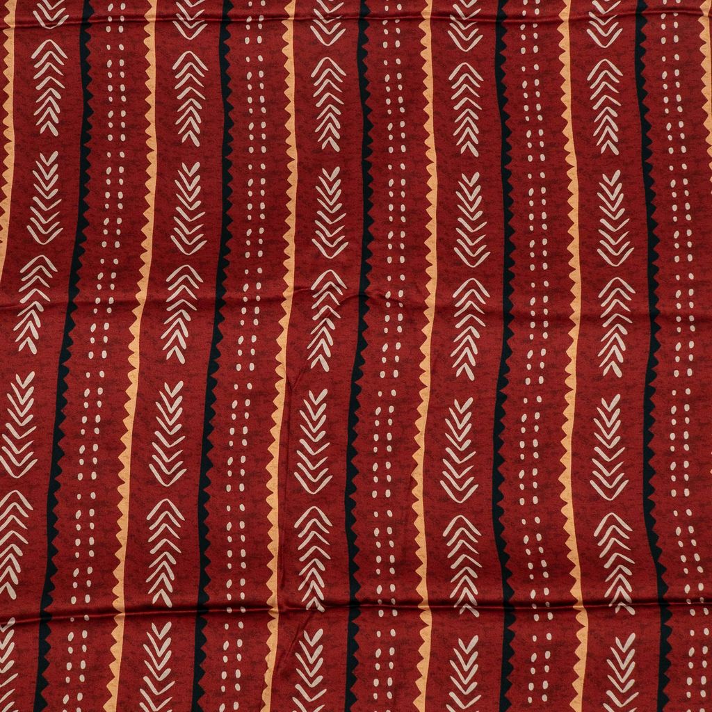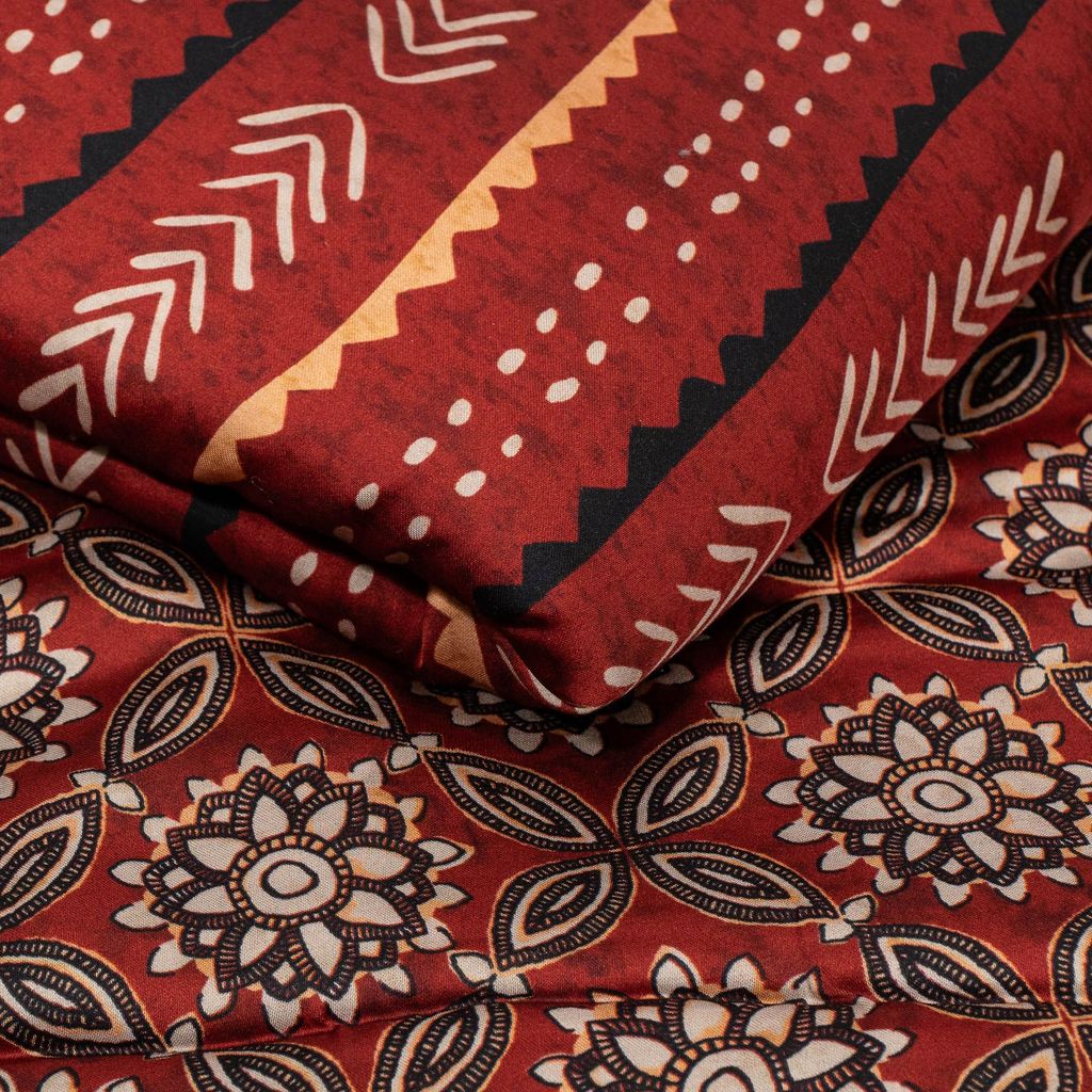 • Ajrakh-inspired motifs with geometric chevron contrast