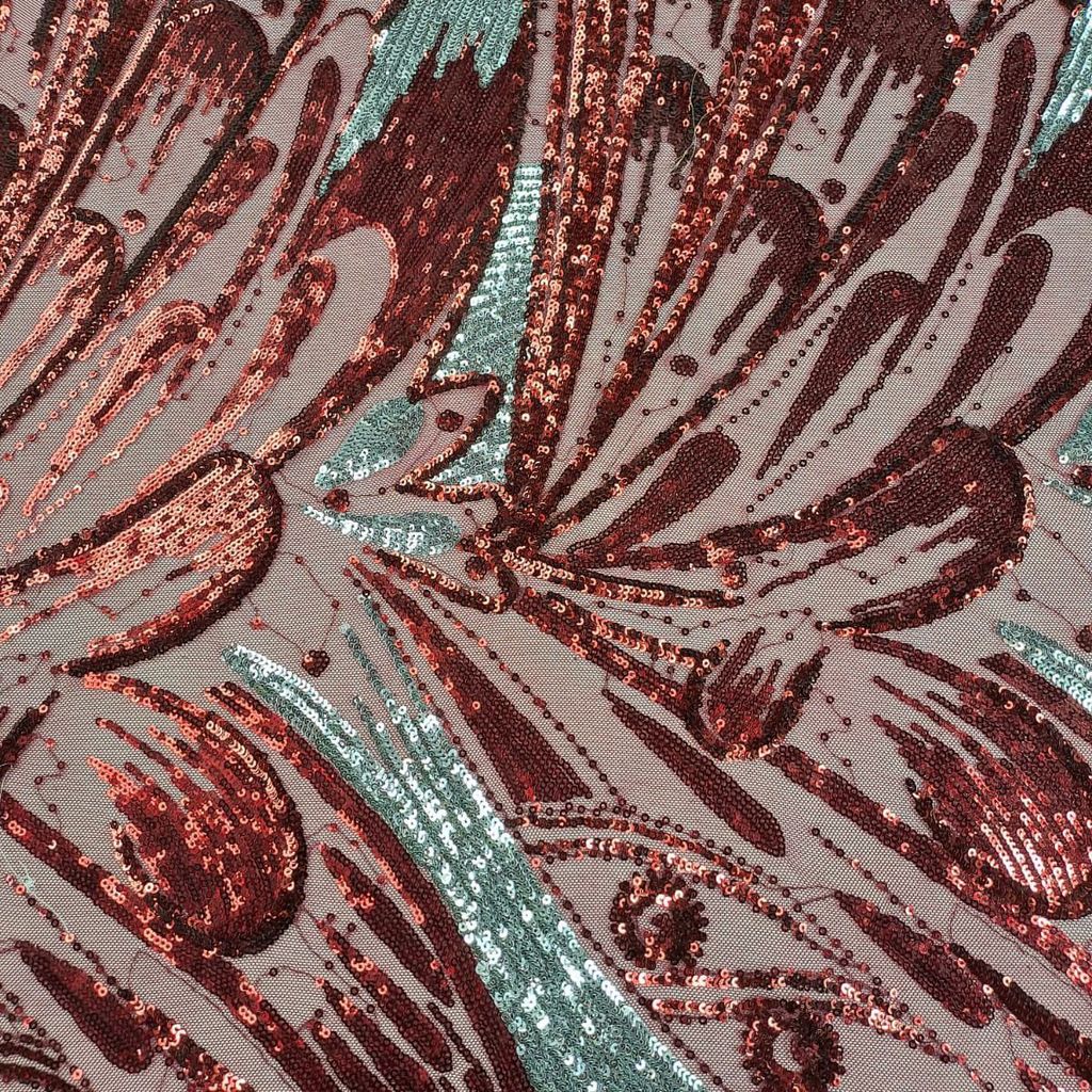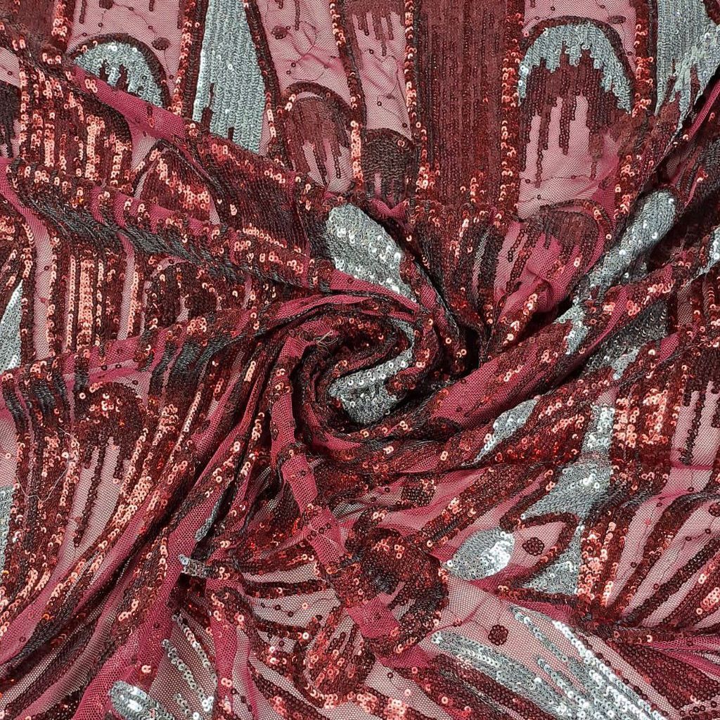 Maroon Imported Sequins Fabric: Rich and festive, this maroon fabric features imported sequins for a luxurious finish. Ideal for crafting opulent and statement pieces with a regal touch.SKU:K4078
