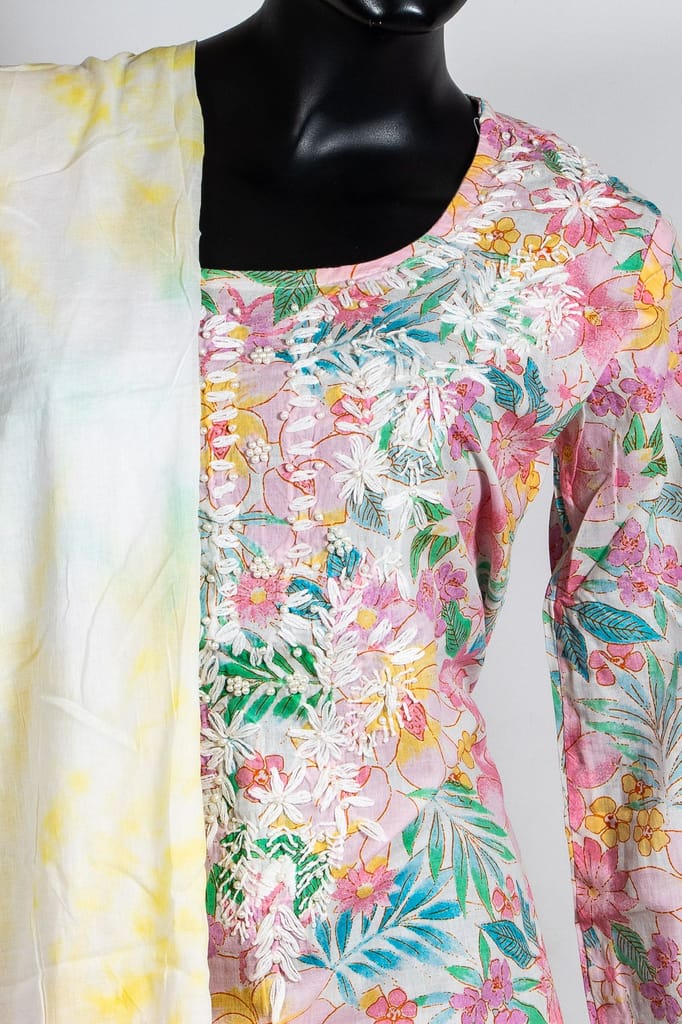 Multicolor Hand-Embroidered Cotton Suit Set with Pink Pant & Tie-Dye Cotton Dupatta