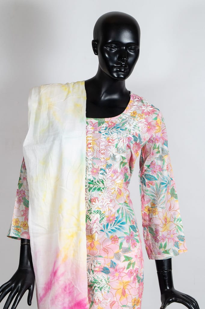 Bring home the charm of florals with this multicolor hand-embroidered cotton suit set, perfect for daytime dressing. The intricately embroidered front panel adds a touch of craftsmanship to the playful floral print. Paired with a solid pink pant and a bright tie-dye dupatta, this set strikes the perfect balance between tradition and trend.