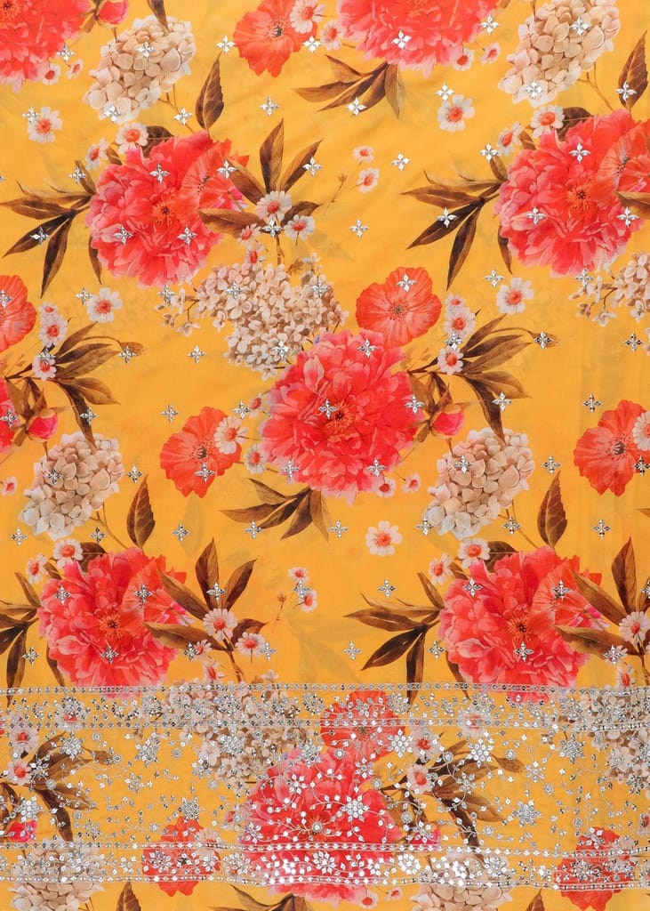 | Fabric Name | Mustard Color Georgette Digital Print With Sequins Embroidery |