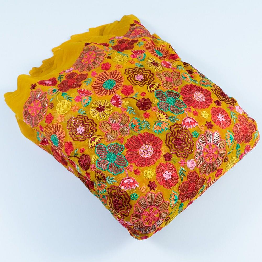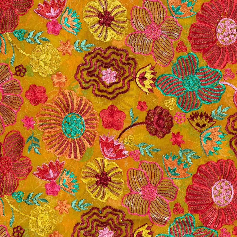 Add grandeur and magnificence with this beautifully designed georgette fabric. The intricately done thread embroidery is paired with fine sequence work. The multi-coloured floral pattern is running across the length. Dipped in rani colour, the fabric has a glossy sheen and flowing texture. The lightweight and durable material adds glamour to your style quotient. Make your dress according to your style and the compliments are coming your way. SKU:100224959