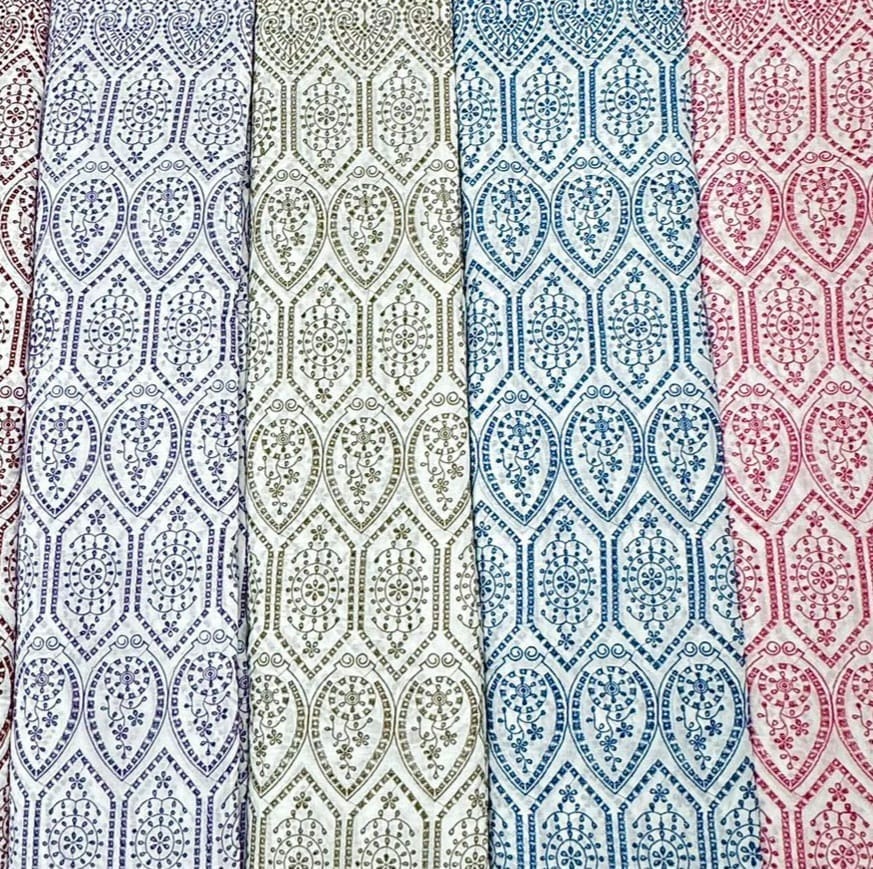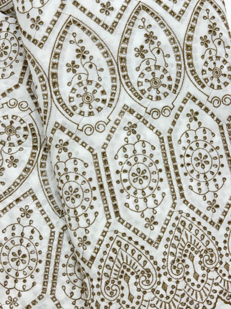 Discover the enchanting beauty of our Chikan Embroidery Fabric. Meticulously crafted with intricate needlework, this fabric showcases delicate floral motifs and geometric designs. Perfect for creating stunning traditional attire or adding elegance to contemporary fashion. Experience the timeless allure of Chikan embroidery and elevate your creations to new heights with this exquisite fabric.Cotton chickan can also be used as embellishments on cushion covers and for home decor. Chickan on cotton base fabric is durable and strong and does not require separate precautionary measures. SKU:SH06. This Cotton Schiffli Embroidered Fabric from FabCouture showcases intricate Chikankari-inspired embroidery, making it ideal for ethnic wear, kurtis, festive blouses, or elegant dresses. Perfect for designers and boutique creators looking for lightweight and stylish fabric.