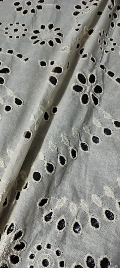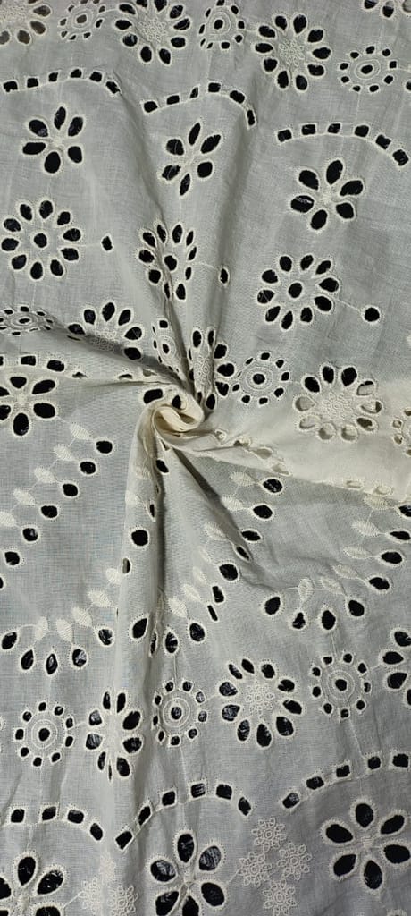 Discover the enchanting beauty of our Chikan Embroidery Fabric. Meticulously crafted with intricate needlework, this fabric showcases delicate floral motifs and geometric designs. Perfect for creating stunning traditional attire or adding elegance to contemporary fashion. Experience the timeless allure of Chikan embroidery and elevate your creations to new heights with this exquisite fabric.Cotton chickan can also be used as embellishments on cushion covers and for home decor. Chickan on cotton base fabric is durable and strong and does not require separate precautionary measures. SKU:AV11. This Cotton Schiffli Embroidered Fabric from FabCouture showcases intricate Chikankari-inspired embroidery, making it ideal for ethnic wear, kurtis, festive blouses, or elegant dresses. Perfect for designers and boutique creators looking for lightweight and stylish fabric.