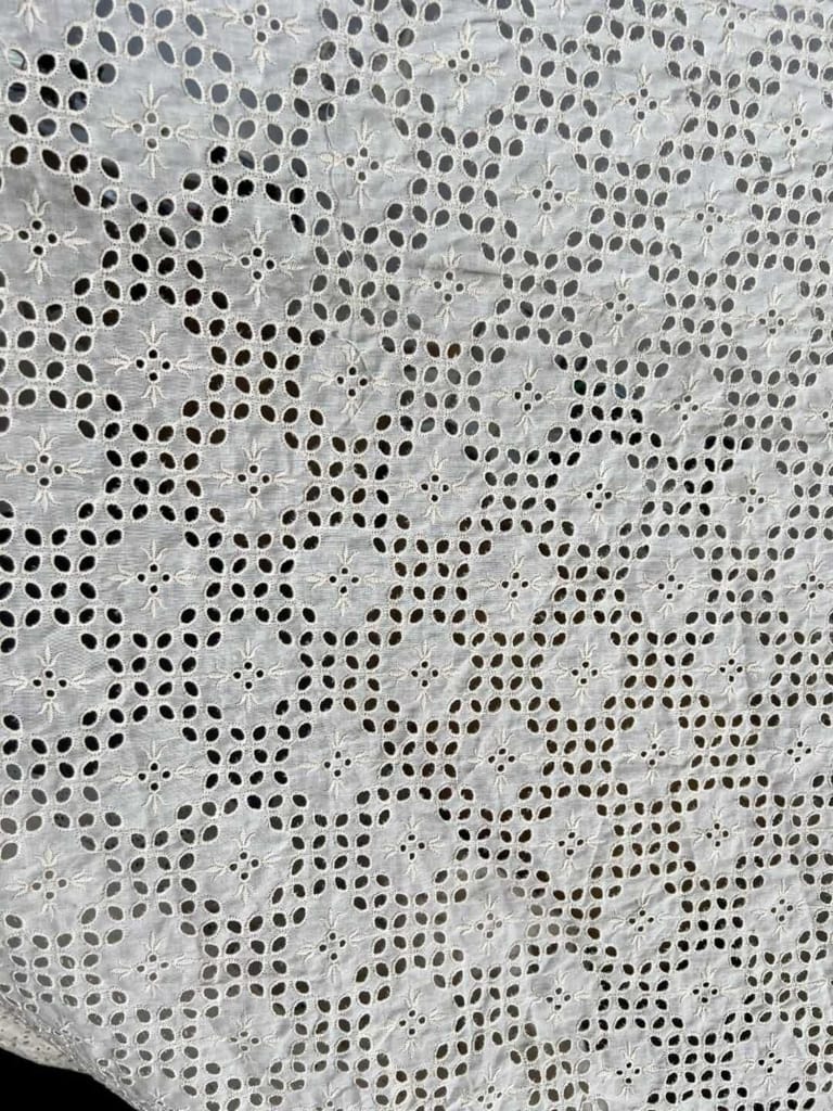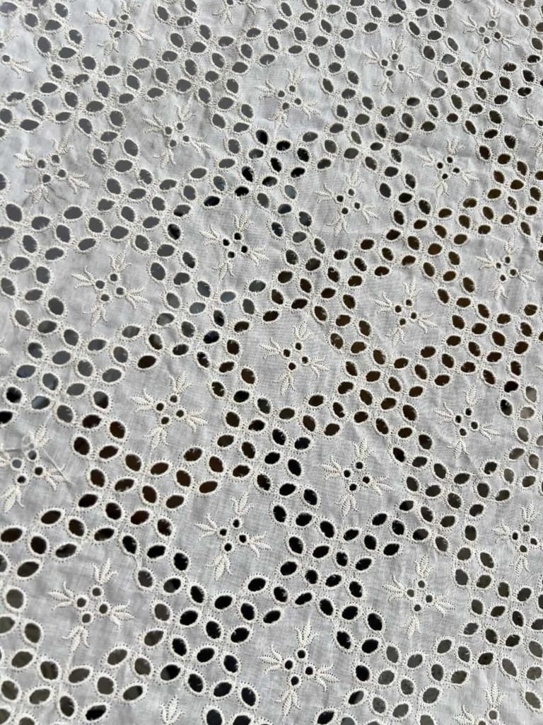 Discover the enchanting beauty of our Chikan Embroidery Fabric. Meticulously crafted with intricate needlework, this fabric showcases delicate floral motifs and geometric designs. Perfect for creating stunning traditional attire or adding elegance to contemporary fashion. Experience the timeless allure of Chikan embroidery and elevate your creations to new heights with this exquisite fabric.Cotton chickan can also be used as embellishments on cushion covers and for home decor. Chickan on cotton base fabric is durable and strong and does not require separate precautionary measures. SKU:FB30. This Cotton Schiffli Embroidered Fabric from FabCouture showcases intricate Chikankari-inspired embroidery, making it ideal for ethnic wear, kurtis, festive blouses, or elegant dresses. Perfect for designers and boutique creators looking for lightweight and stylish fabric.