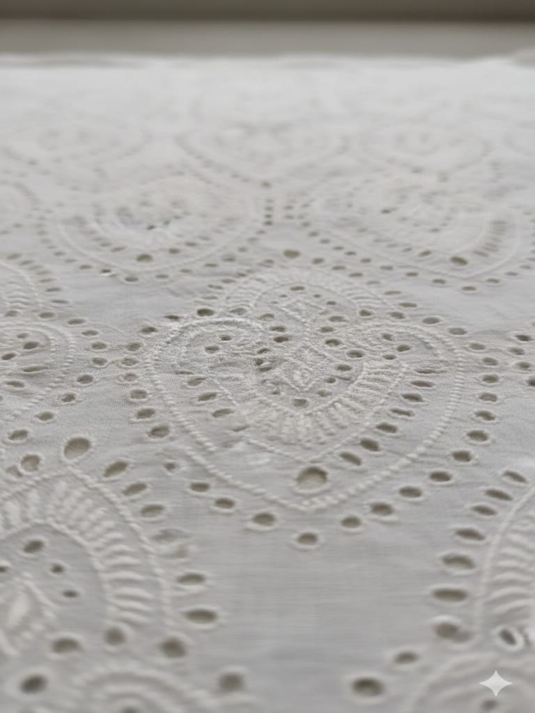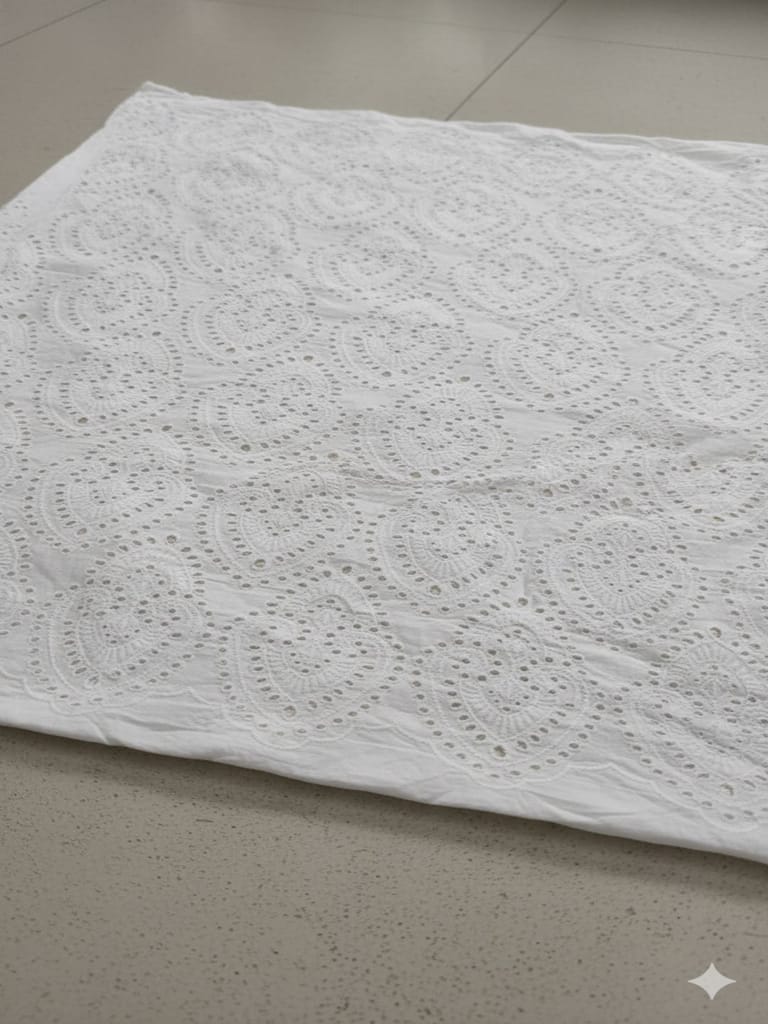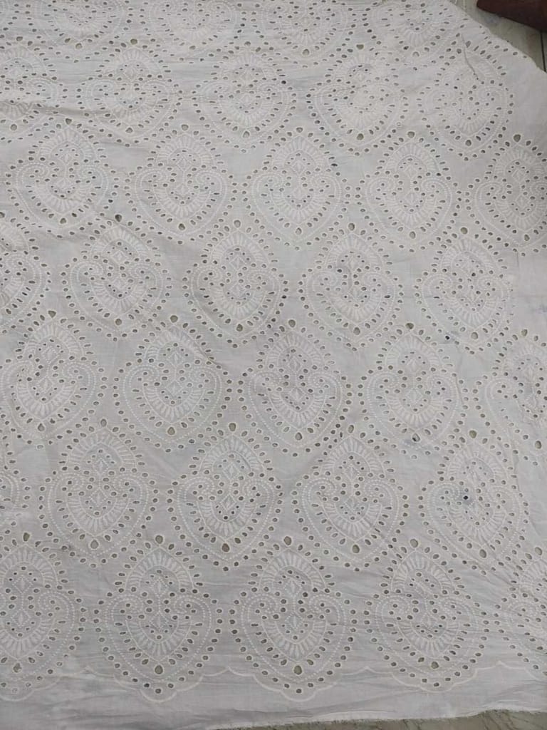 Discover the enchanting beauty of our Chikan Embroidery Fabric. Meticulously crafted with intricate needlework, this fabric showcases delicate floral motifs and geometric designs. Perfect for creating stunning traditional attire or adding elegance to contemporary fashion. Experience the timeless allure of Chikan embroidery and elevate your creations to new heights with this exquisite fabric.Cotton chickan can also be used as embellishments on cushion covers and for home decor. Chickan on cotton base fabric is durable and strong and does not require separate precautionary measures. SKU:FB28. This Cotton Schiffli Embroidered Fabric from FabCouture showcases intricate Chikankari-inspired embroidery, making it ideal for ethnic wear, kurtis, festive blouses, or elegant dresses. Perfect for designers and boutique creators looking for lightweight and stylish fabric.