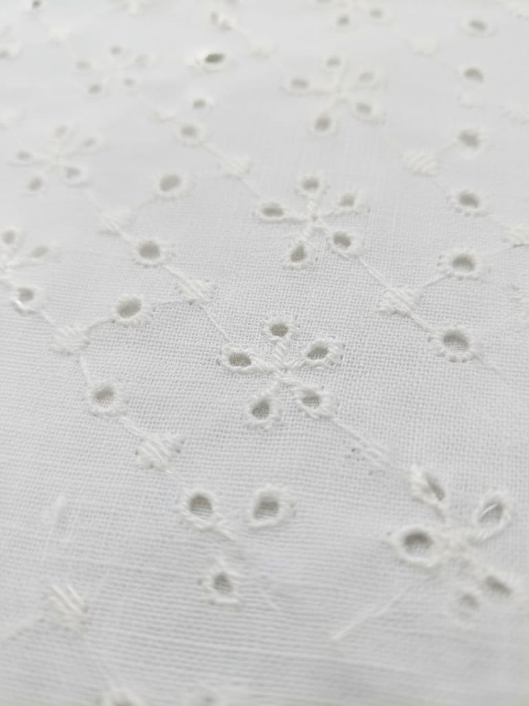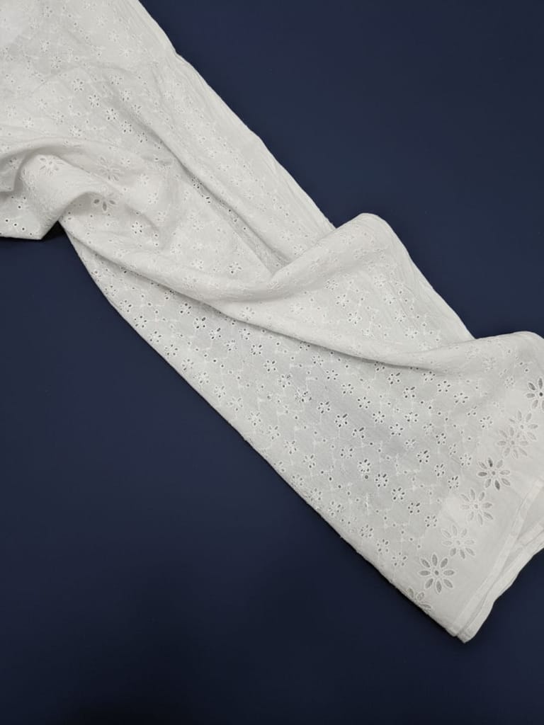 Discover the enchanting beauty of our Chikan Embroidery Fabric. Meticulously crafted with intricate needlework, this fabric showcases delicate floral motifs and geometric designs. Perfect for creating stunning traditional attire or adding elegance to contemporary fashion. Experience the timeless allure of Chikan embroidery and elevate your creations to new heights with this exquisite fabric.Cotton chickan can also be used as embellishments on cushion covers and for home decor. Chickan on cotton base fabric is durable and strong and does not require separate precautionary measures. SKU:FB27. This Cotton Schiffli Embroidered Fabric from FabCouture showcases intricate Chikankari-inspired embroidery, making it ideal for ethnic wear, kurtis, festive blouses, or elegant dresses. Perfect for designers and boutique creators looking for lightweight and stylish fabric.