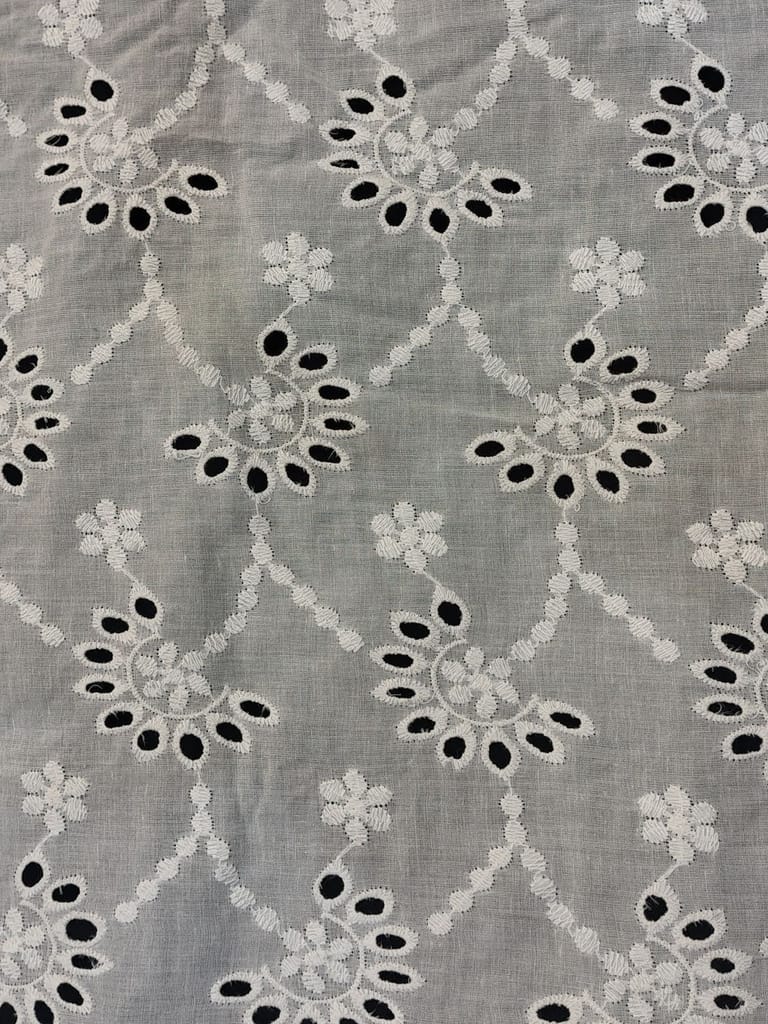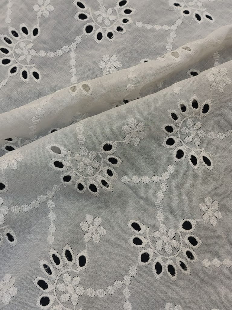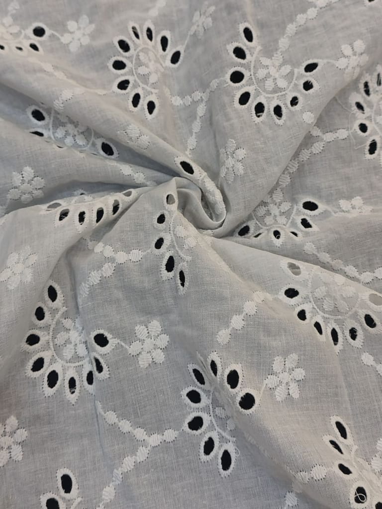 Discover the enchanting beauty of our Chikan Embroidery Fabric. Meticulously crafted with intricate needlework, this fabric showcases delicate floral motifs and geometric designs. Perfect for creating stunning traditional attire or adding elegance to contemporary fashion. Experience the timeless allure of Chikan embroidery and elevate your creations to new heights with this exquisite fabric.Cotton chickan can also be used as embellishments on cushion covers and for home decor. Chickan on cotton base fabric is durable and strong and does not require separate precautionary measures. SKU:FB08. This Cotton Schiffli Embroidered Fabric from FabCouture showcases intricate Chikankari-inspired embroidery, making it ideal for ethnic wear, kurtis, festive blouses, or elegant dresses. Perfect for designers and boutique creators looking for lightweight and stylish fabric.