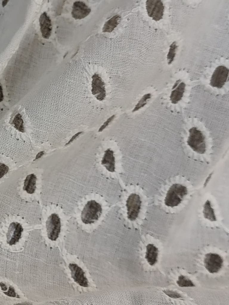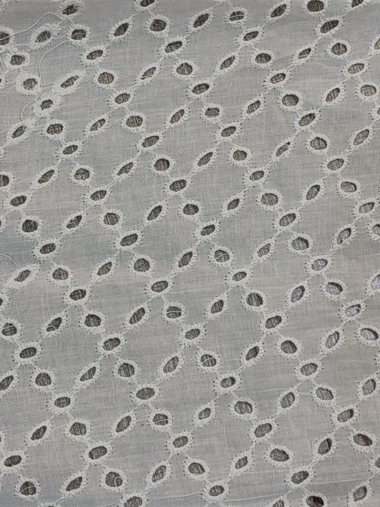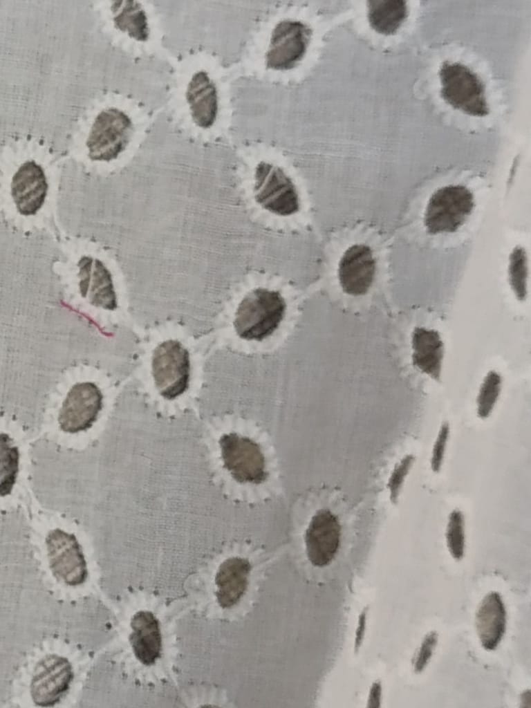 Discover the enchanting beauty of our Chikan Embroidery Fabric. Meticulously crafted with intricate needlework, this fabric showcases delicate floral motifs and geometric designs. Perfect for creating stunning traditional attire or adding elegance to contemporary fashion. Experience the timeless allure of Chikan embroidery and elevate your creations to new heights with this exquisite fabric.Cotton chickan can also be used as embellishments on cushion covers and for home decor. Chickan on cotton base fabric is durable and strong and does not require separate precautionary measures. SKU:FB06. This Cotton Schiffli Embroidered Fabric from FabCouture showcases intricate Chikankari-inspired embroidery, making it ideal for ethnic wear, kurtis, festive blouses, or elegant dresses. Perfect for designers and boutique creators looking for lightweight and stylish fabric.