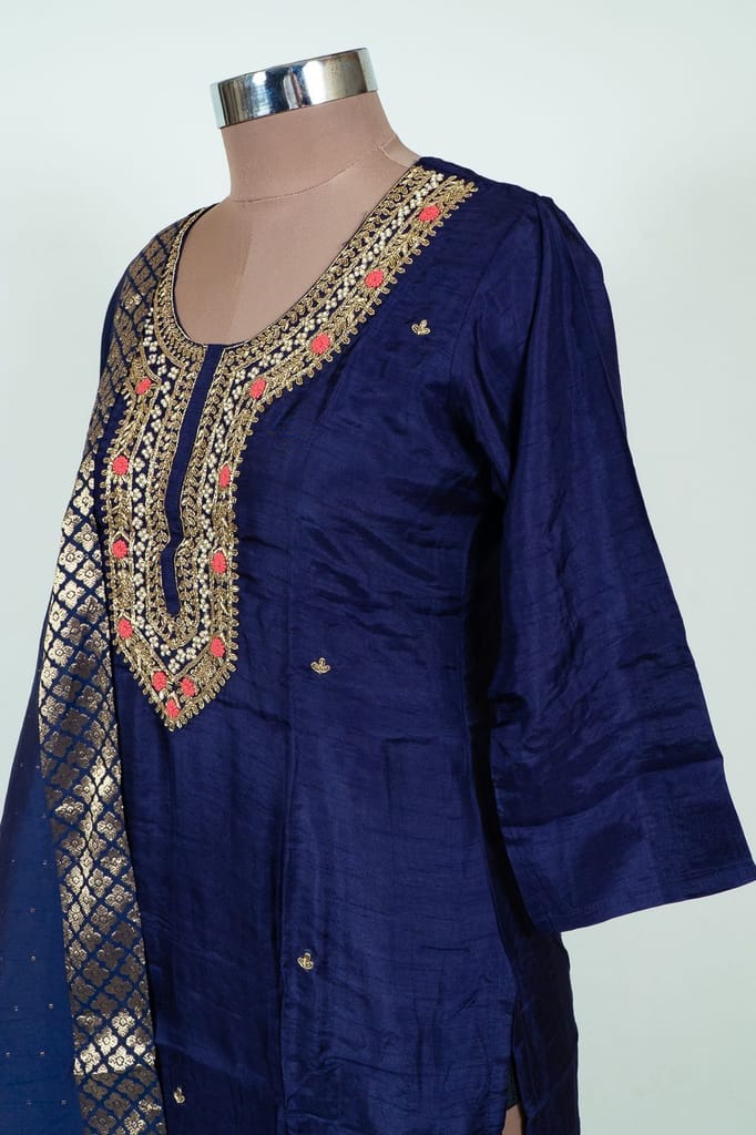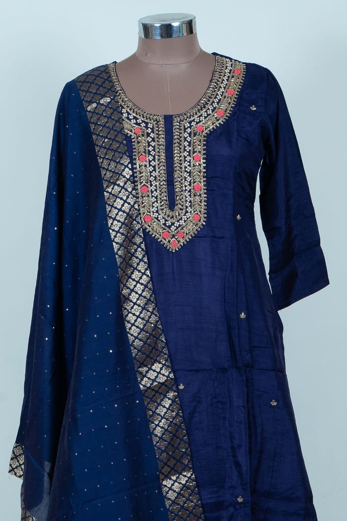 | Fabric Name | Navy Blue Color Embroidered Dola Silk Shirt with Pant and Embroidered Chanderi Dupatta |