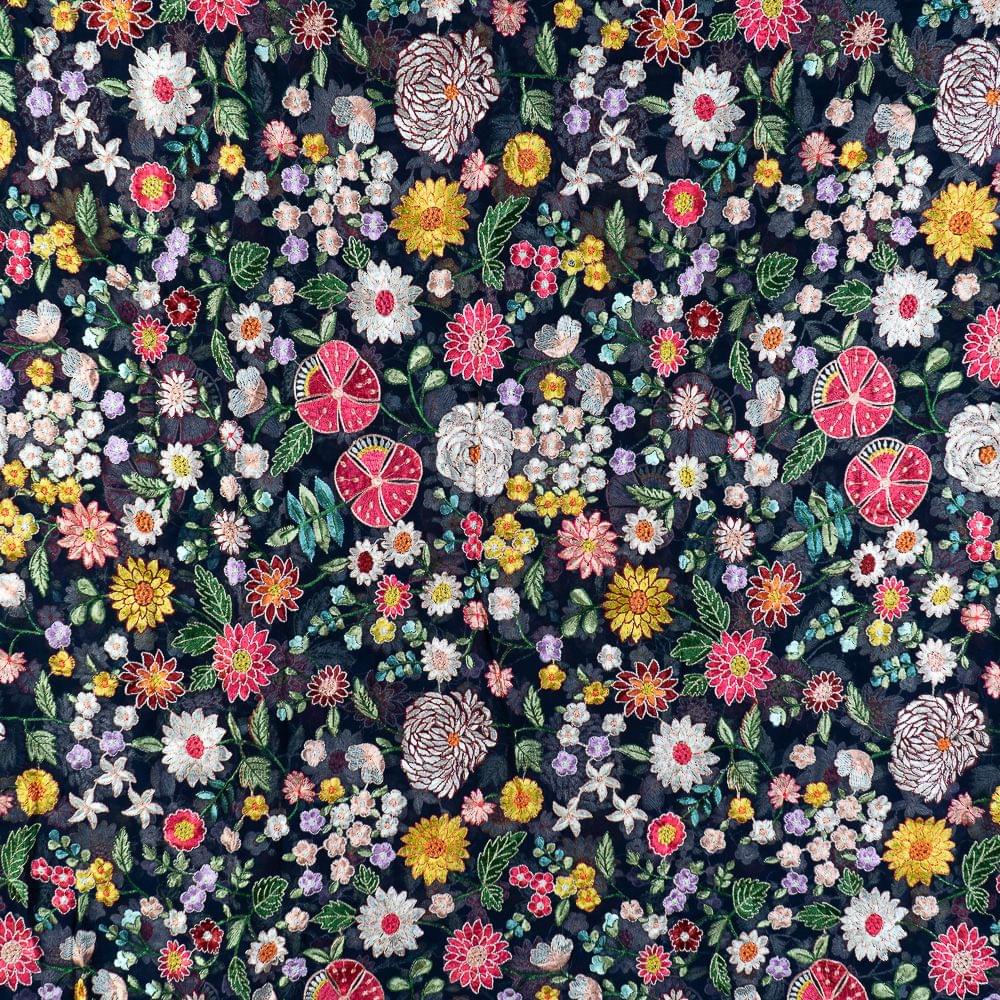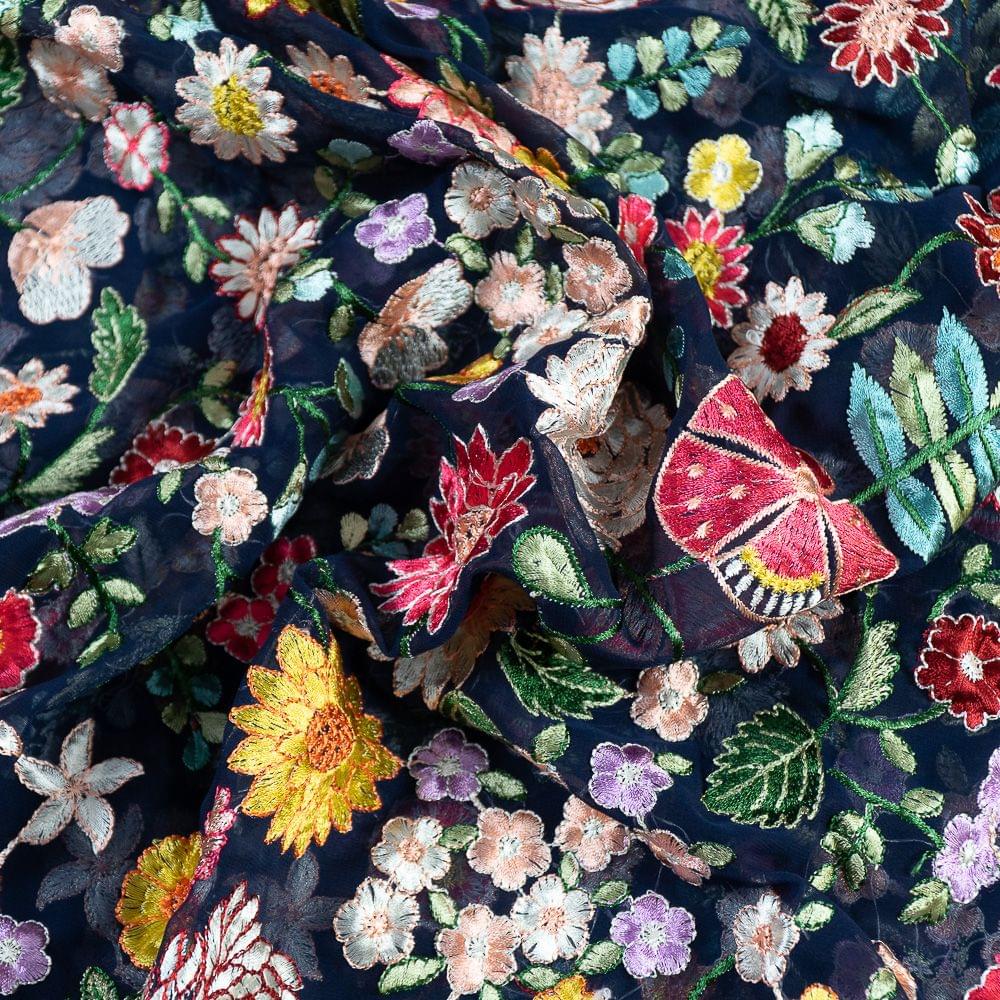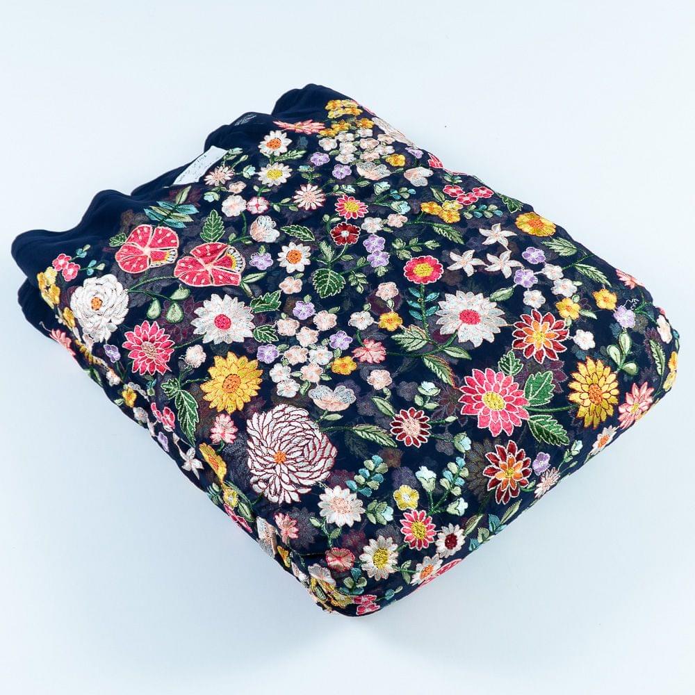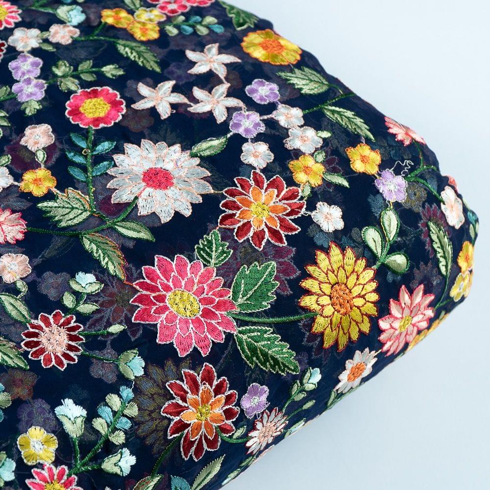 With the festive season knocking on your door, get ready with the elegant and finely detailed navy-blue georgette embroidered fabric. The multi-colour heavy floral embroidery is spread across the length of the fabric. The fine details of each motif look royal and sumptuous, taking your style sense to a new level. The soft and sheer texture and a pinch of shine add a quirkiness to the fabric. Design your favourite outfit with this affordable fabric brought to you by the House of Fab Couture. SKU: 100225022