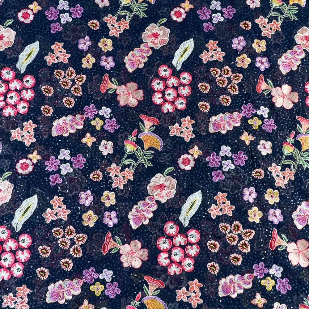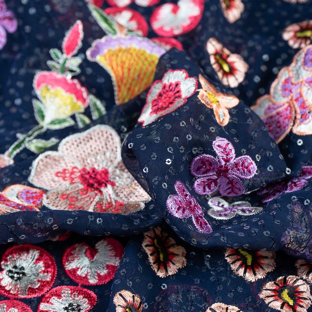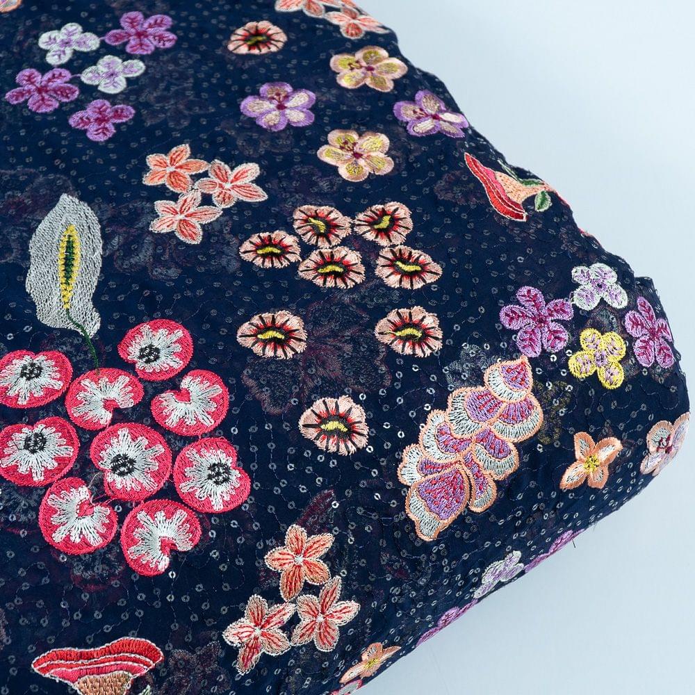 With the festive season knocking on your door, get ready with the elegant and finely detailed navy blue georgette embroidered fabric. The multi-colour heavy floral embroidery along with sprinkling of sequins work is spread across the length of the fabric. The fine details of each motif look royal and sumptuous, taking your style sense to a new level. The soft and sheer texture and a pinch of shine add a quirkiness to the fabric. Design your favourite outfit with this affordable fabric brought to you by the House of Fab Couture. SKU: 100225105