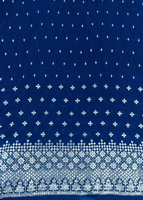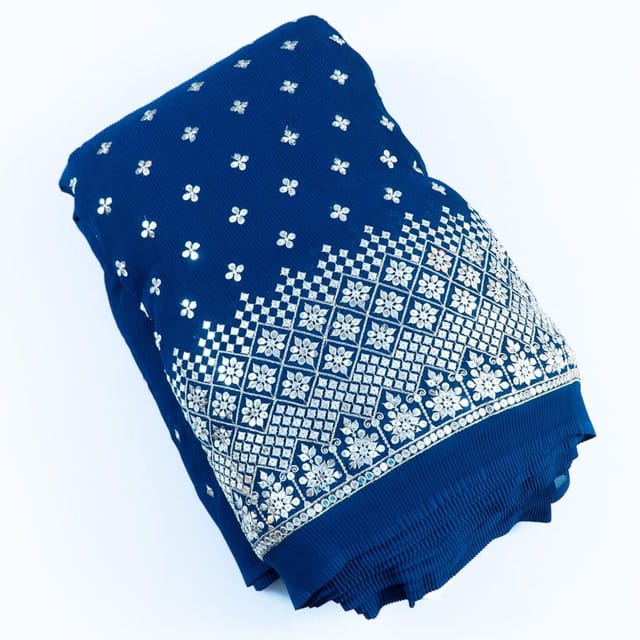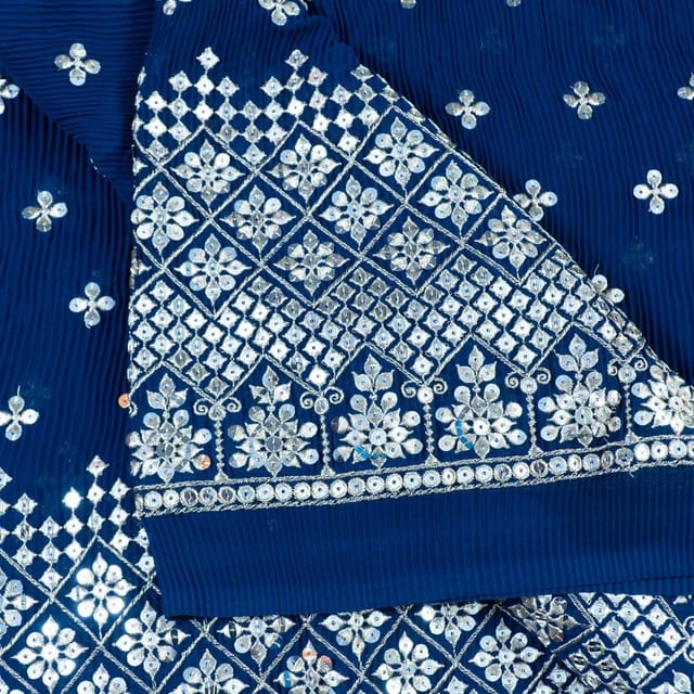 Fabcouture showcases a royal collection of pleated georgette fabric. The majestic design and evergreen colours are a heart throbber. The light golden-toned sequin and zari embroidery are spread all over the fabric. The mere glance at the magnificent border design is the cherry on the top. The lightweight fabric can be worn in all weathers. The premium fabric comes in so many viberant colours to choose from. Get a customized outfit ready for the next wedding shenanigan. SKU: 100224855
