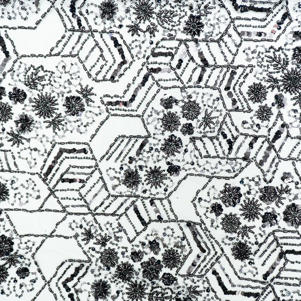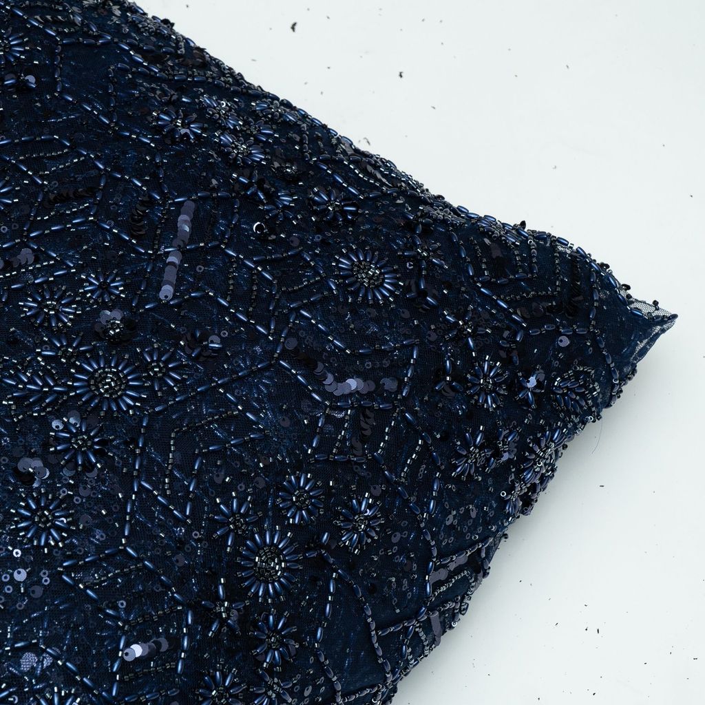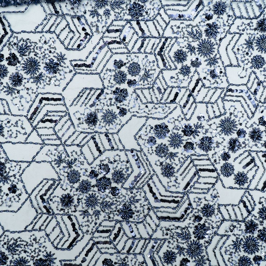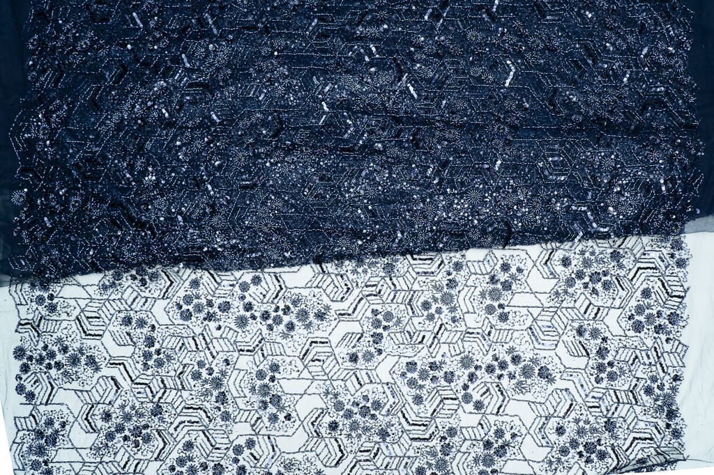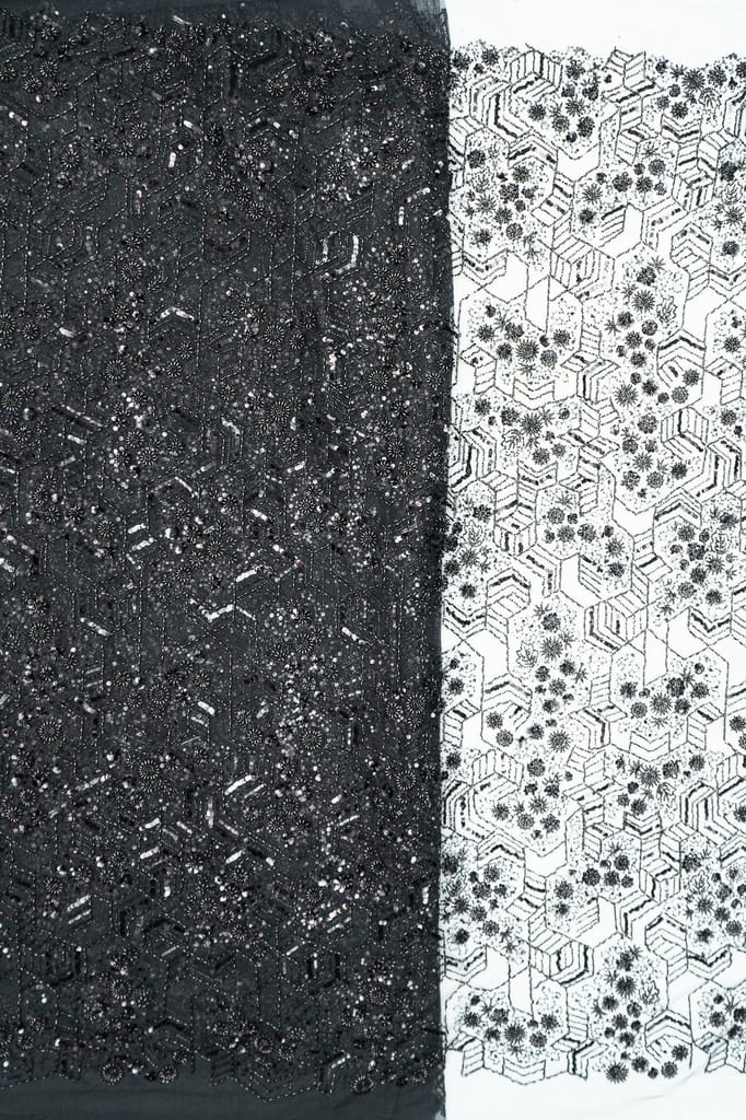 Net hand-embroidered fabric combines delicate netting with intricate hand-stitched embellishments. Artisans skillfully create unique patterns using needle and thread, enhancing the fabric's elegance. This luxurious textile is prized for its intricate detailing, making it a preferred choice for exquisite dresses and glamorous attire, adding a touch of craftsmanship to fashion. SKU:8023112356