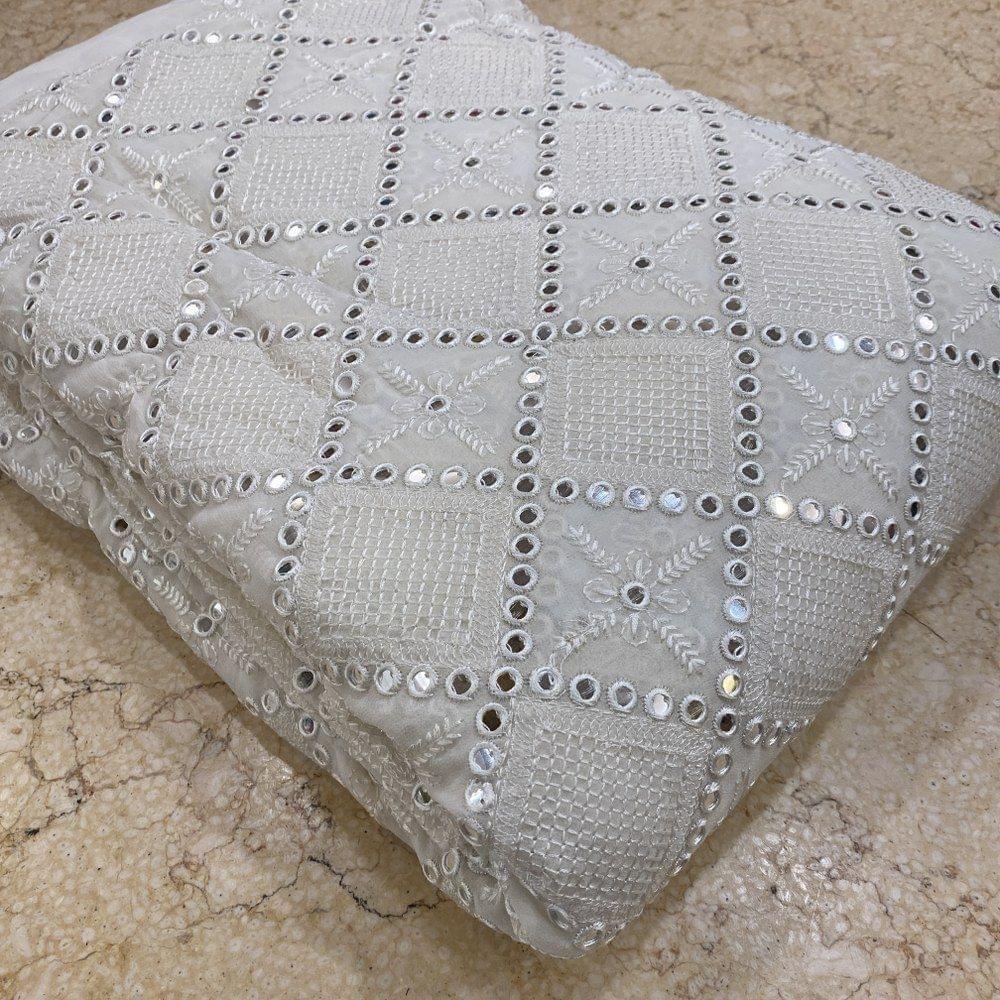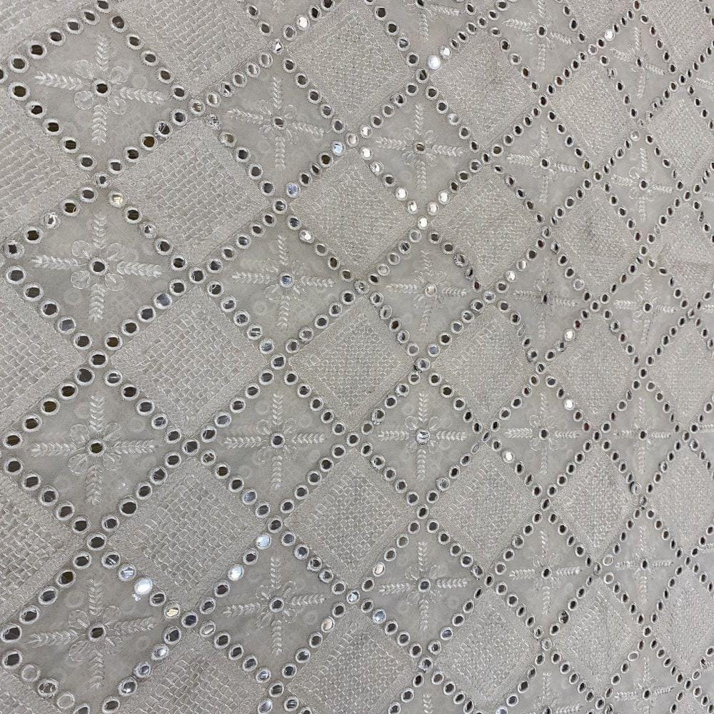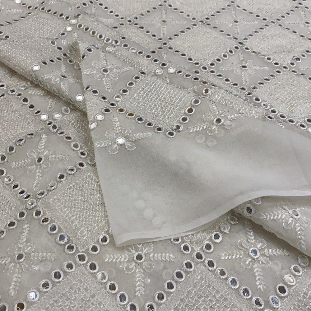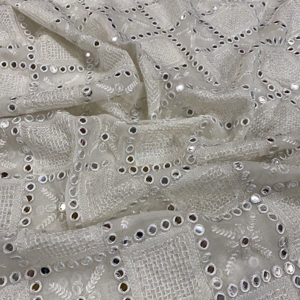 Off-White Colour Georgette Faux Mirror Embroidery,This dyeable faux mirror embroidery on georgette is a good fabric for blouses, sarees, lehengas and kurtas. SKU: 100205497