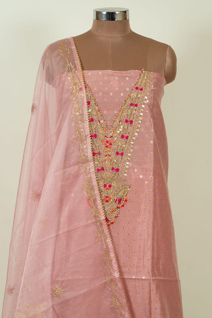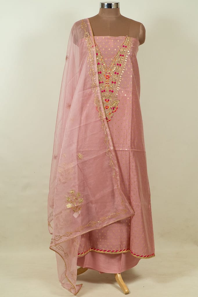 | Fabric Name | Onion Pink Color Chanderi Embroidered Shirt with Bottom and Organza Embroidered Dupatta |