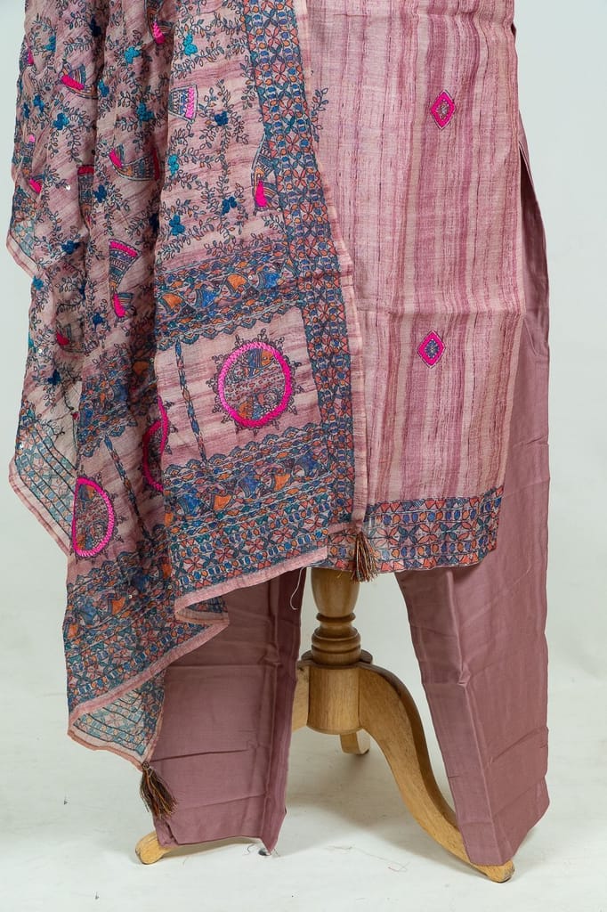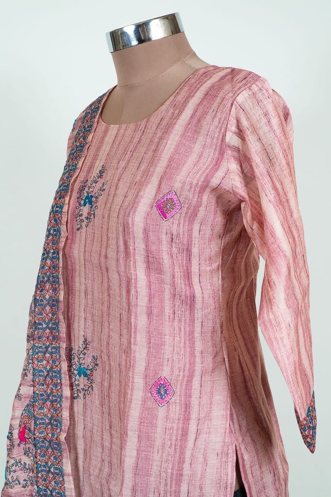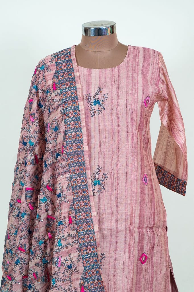 Introducing Fabcouture's Onion Pink colour Print with Kantha Embroidery Dola Silk Shirt paired gracefully with matching Pant and a luxurious Silk Embroidered Dupatta. This ensemble embodies grace and style, making it ideal for those seeking a perfect blend of tradition and contemporary fashion for any occasion. SKU:100235416 D.No. 4544