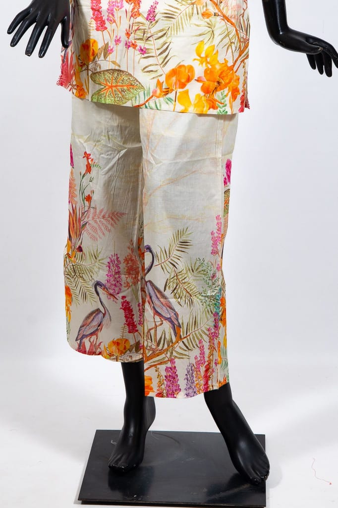 This set features a collared kurti-style top with a delicately embroidered front neck patti, adding a touch of elegance and craftsmanship. The digitally printed motifs depict a vibrant tropical forest theme, with flamingos, lush foliage, and earthy flora in a blend of coral, orange, and fuchsia hues over a subtle cream base — creating a fresh and lively aesthetic.