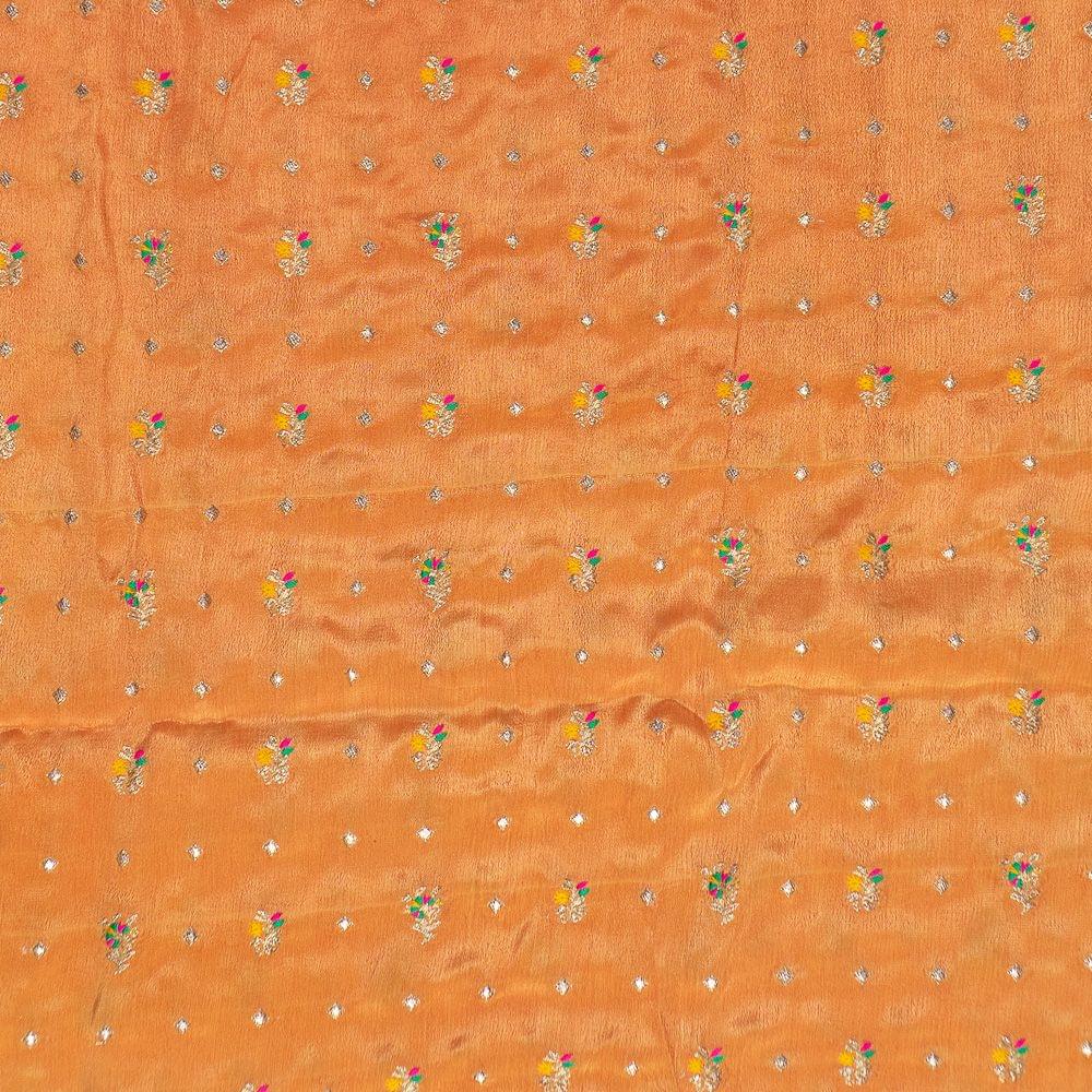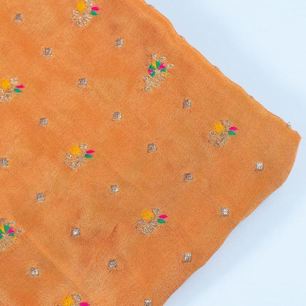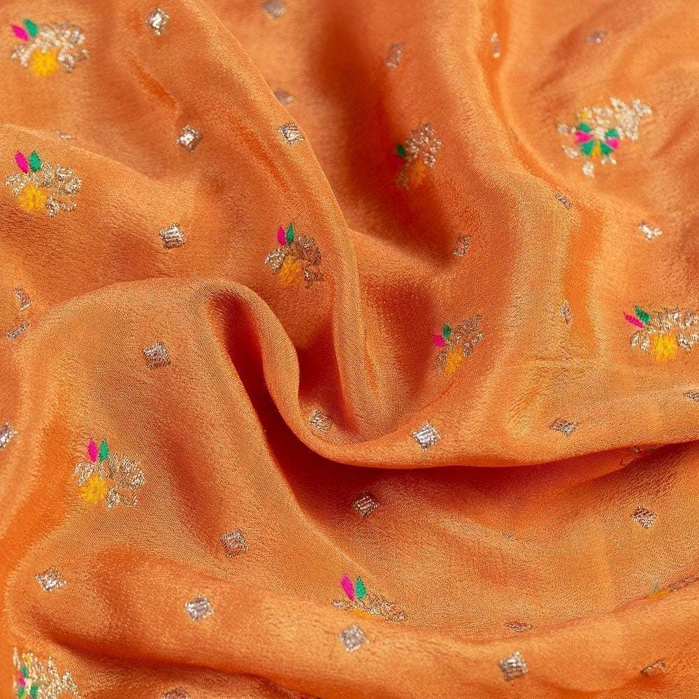 Orange Chinon chiffon Jacquard Booti with Green, rani and yellow meena with zari Booti which makes it very unique and different. This can dyed any dark, light or pastel shades and can be used in making skirts, tops, kurtas, sarees, dupatas and anrkalies. You can also combine them with matching fabrics to create your own look. SKU:10022236
