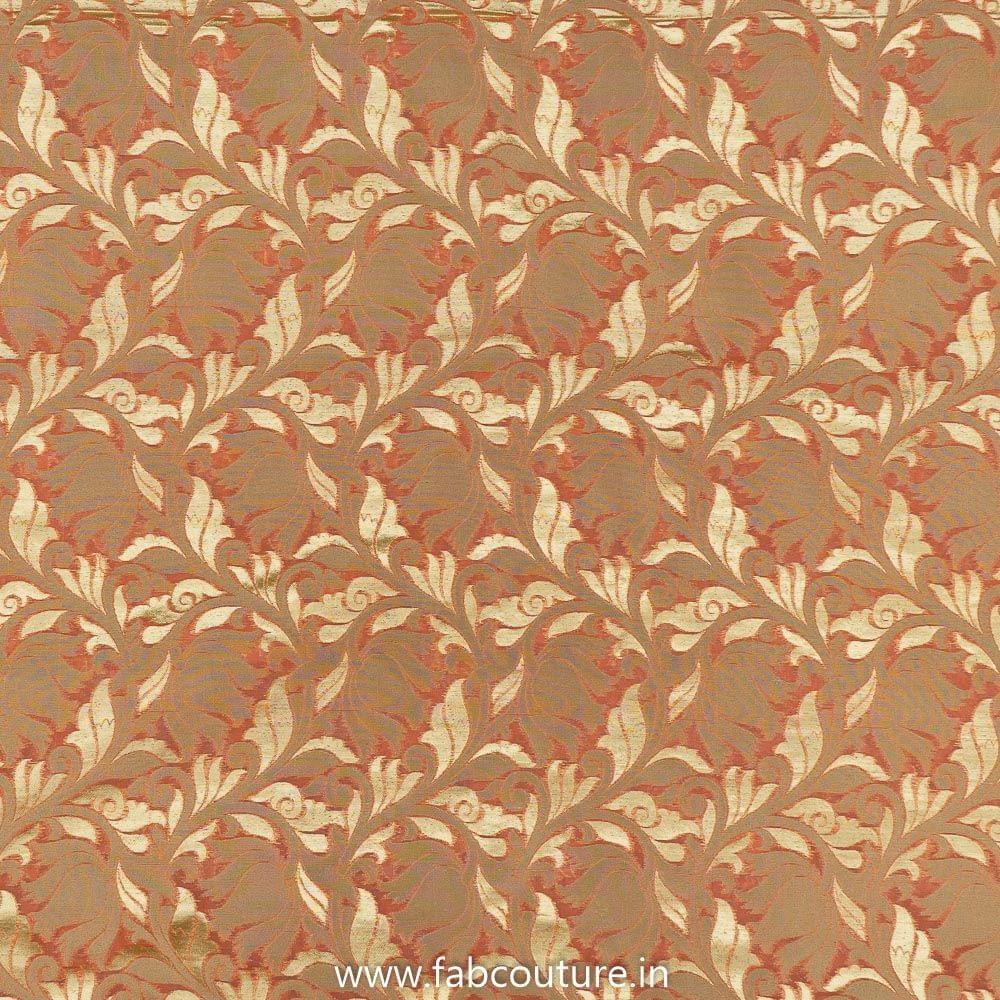 Peach chanderi jacquard fabric is from FabCouture Chanderi Collection and is best for salwar kameez, jackets, trousers, lehengas and all. It is a rich fabric with gold patterns on it. SKU: 9918146