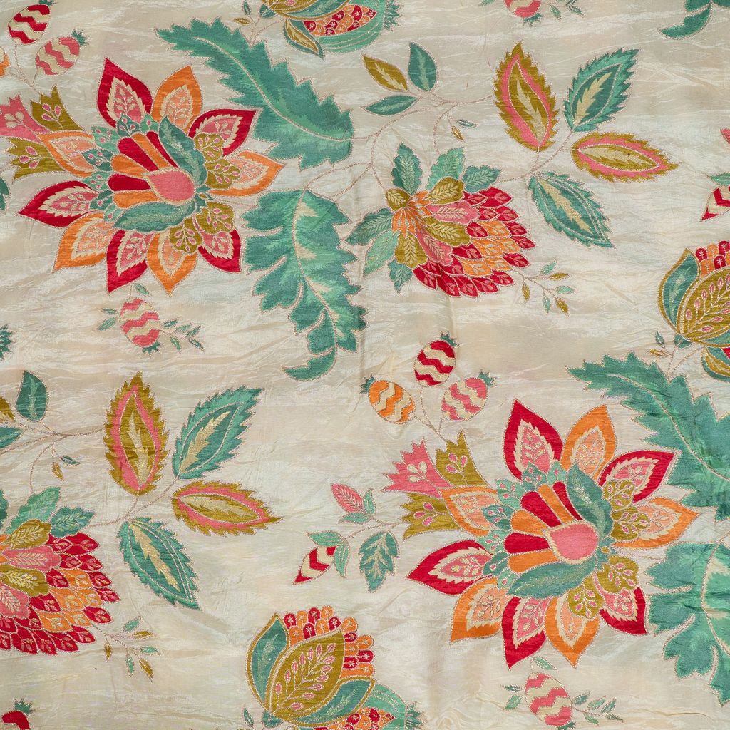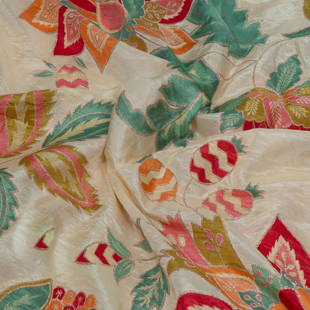 Embrace vibrant artistry with our stunning Dola Silk Jacquard Printed Fabric. This luxurious fabric beautifully combines the smooth, lustrous drape of Dola Silk with an intricate, all-over jacquard texture, which is then overlaid with rich, colorful prints.