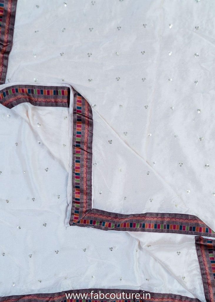 This is from FabCouture Unstitched Suits Collection and the fabric is satin with block print all over and a printed neckline which has been highlighted with cutdana embroidery. There is a temple border in the daman. It has 2.5mtr cotton print bottom which can be stitched into a trouser, salwar, churidaar, plazzo or dhoti as per your choice. The dupatta is embroidered chiffon with temple border. SKU: 100211080 DNO-3173