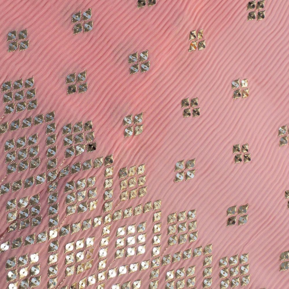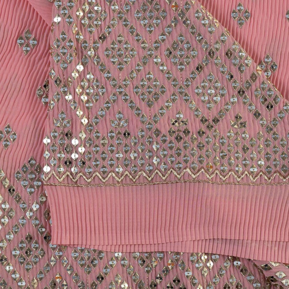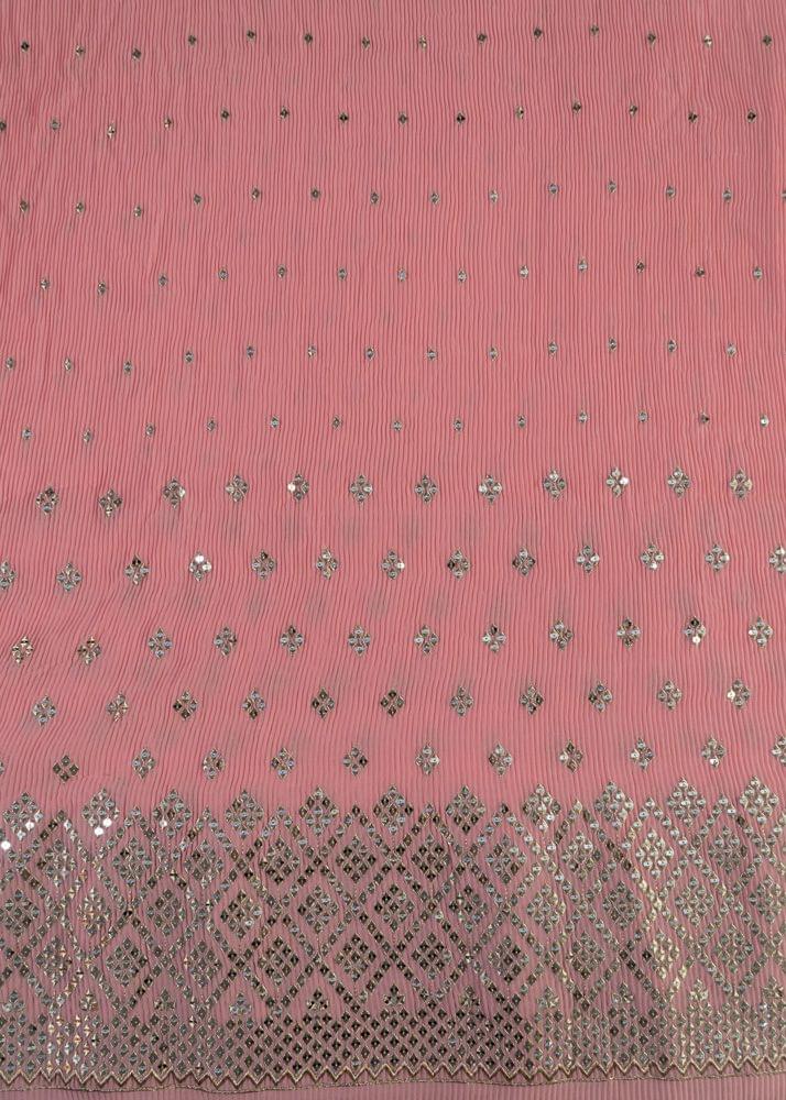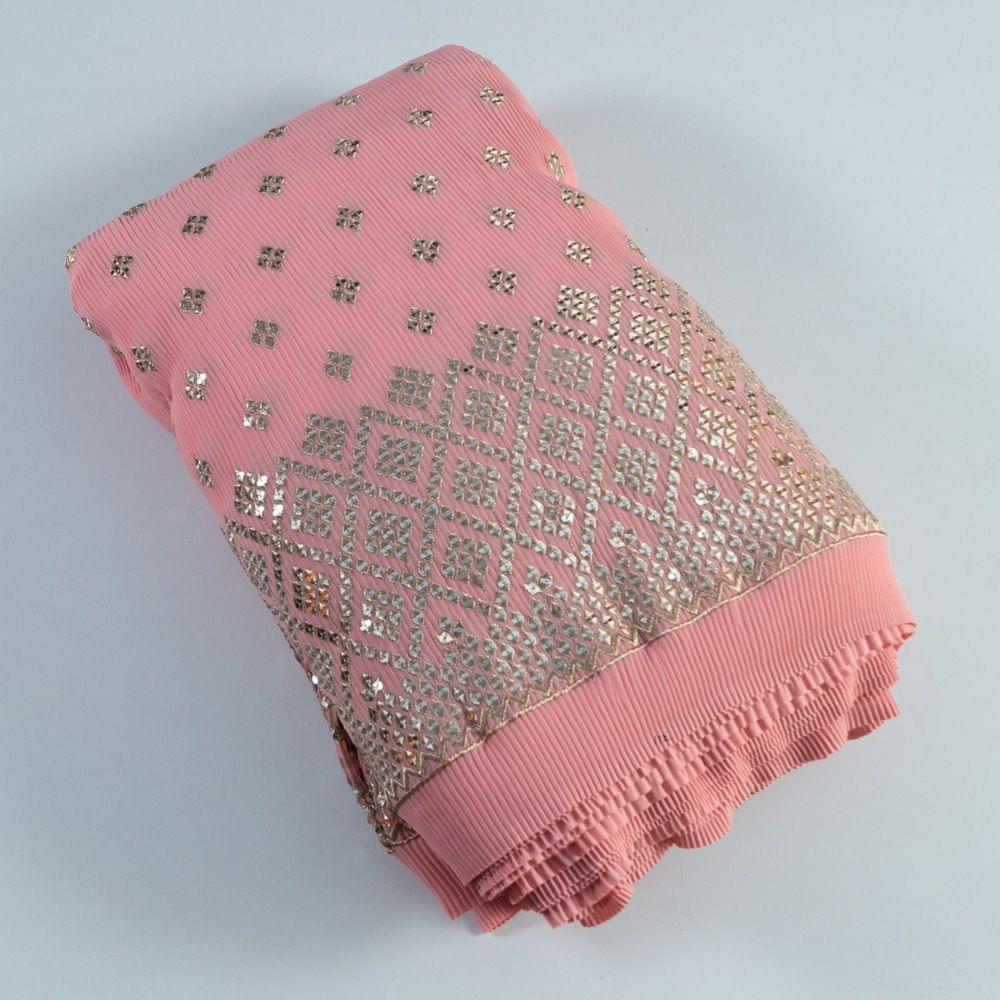 Fabcouture always tries to bring the latest trends to you, just like this pleated georgette fabric. The edit has beautiful glossy pastel shades with mirror embroidery running on the piece of clothing. The border has an alluring geometric pattern which looks accentuating. The lightweight fabric is highly durable and never goes out of fashion. You can make bridesmaid lehengas to beautiful salwar kameez to Indo-western attires. SKU : 100224827