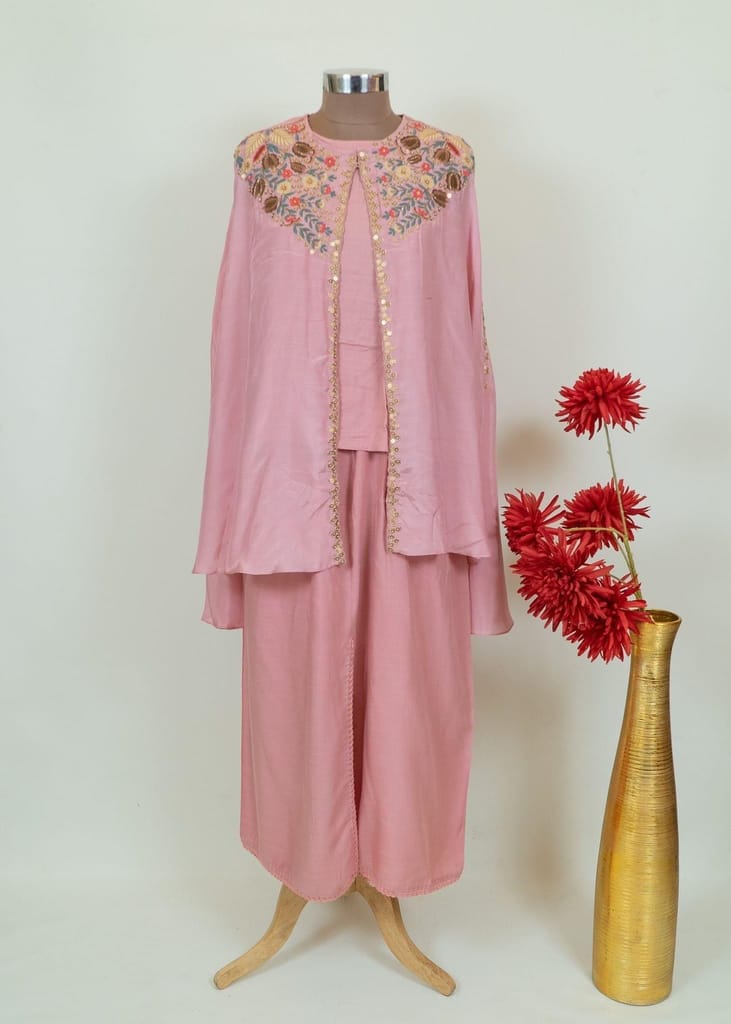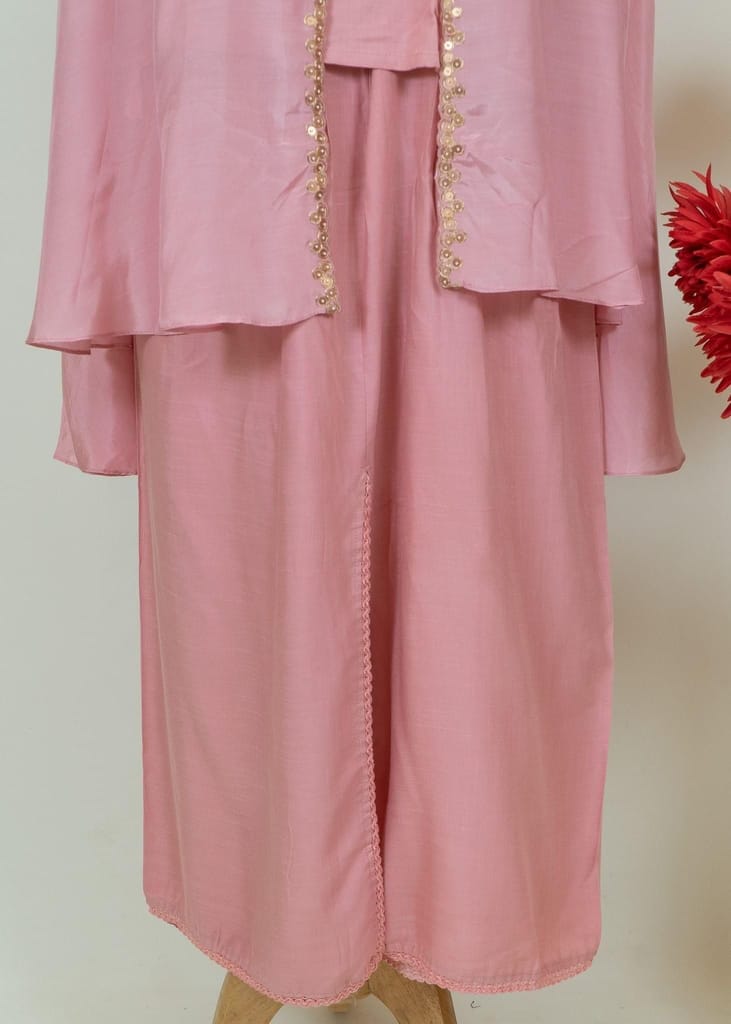 With exclusivity on the mind, the house of Fab Couture brings a collection for celebrating all those festivities and shenanigans. The two-piece co-ord set comes with silk palazzo and a muslin shrug-style top. The floral pattern has been embroidered all the yoke and the neckline adding a glitz and glam to the outfit. The intricate embroidery is combined with pearl work running down the slit. The palazzo is adorned with a minimalistic crochet lace. If you are looking for comfort and style, then this ensemble is for you.SKU: 100225945(NS067)