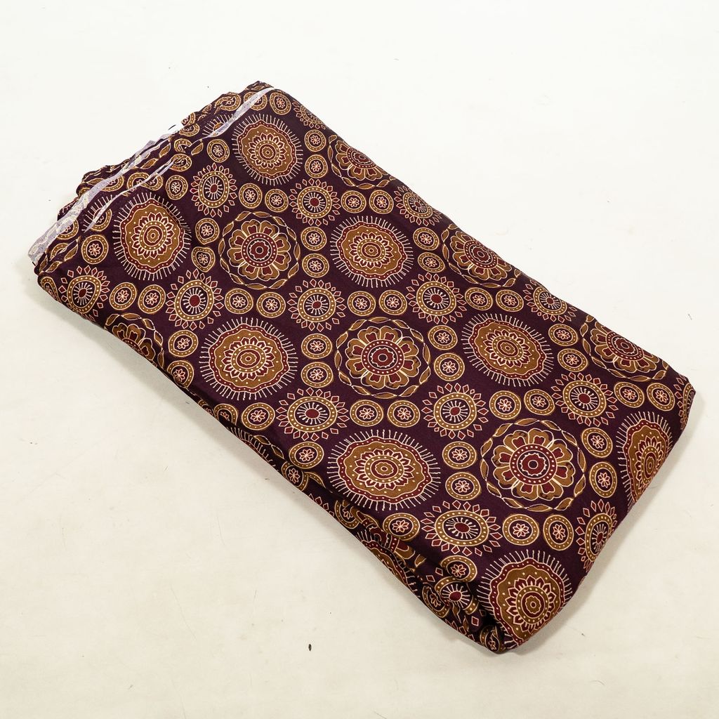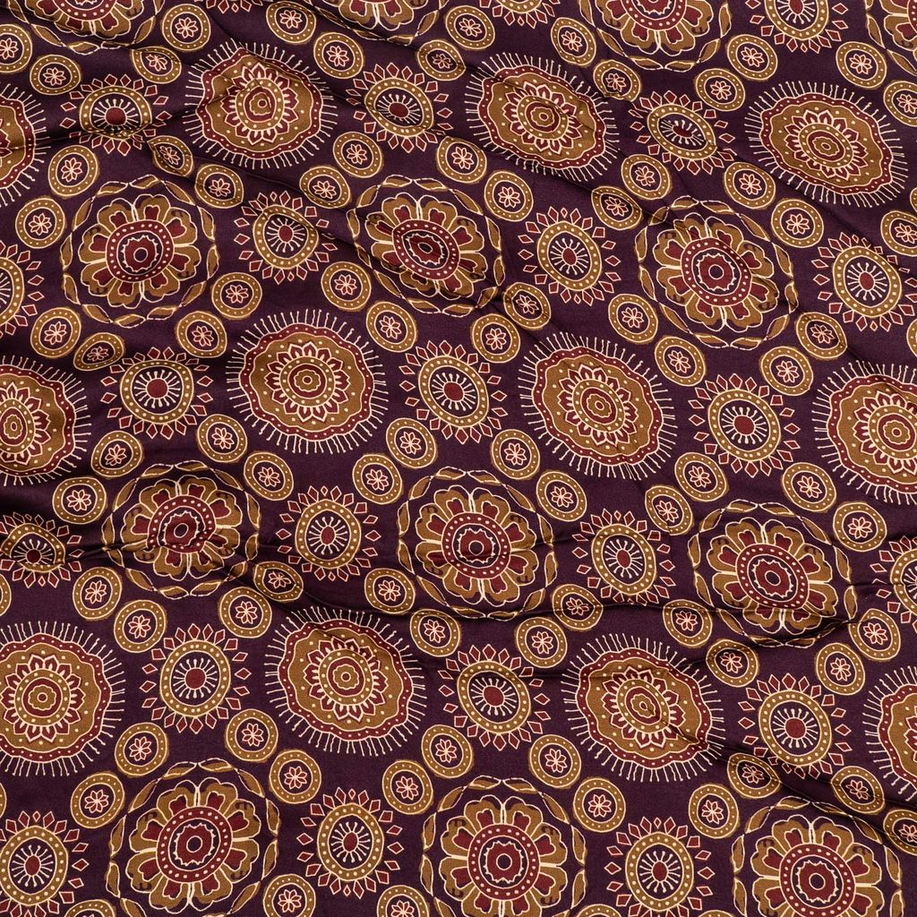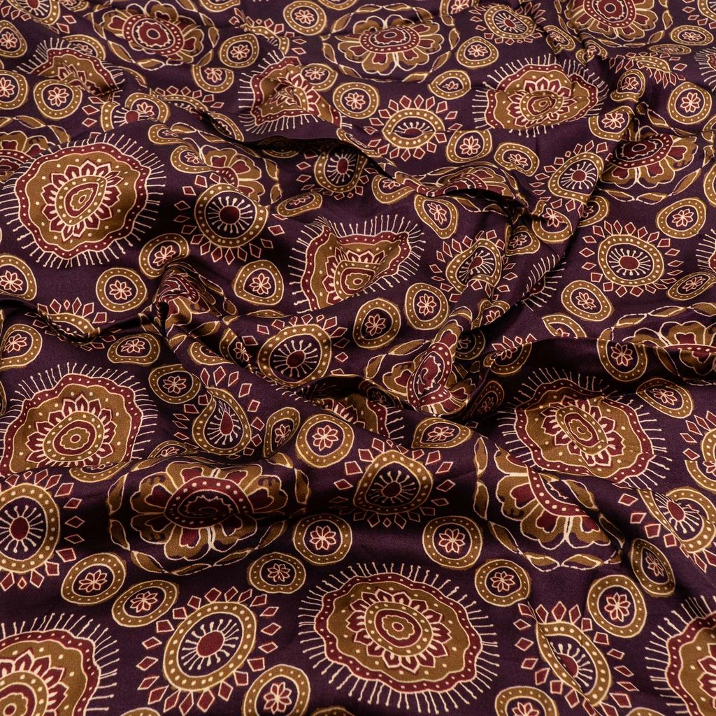 Crafted from smooth 100 GSM modal satin with a 44-inch width, this fabric offers a soft, silky touch and a beautiful natural sheen. The satin weave enhances the richness of the colors, while the high-definition digital printing highlights the fine detailing of the ornamental motifs. Its fluid drape and premium finish make it ideal for elegant and designer garments.