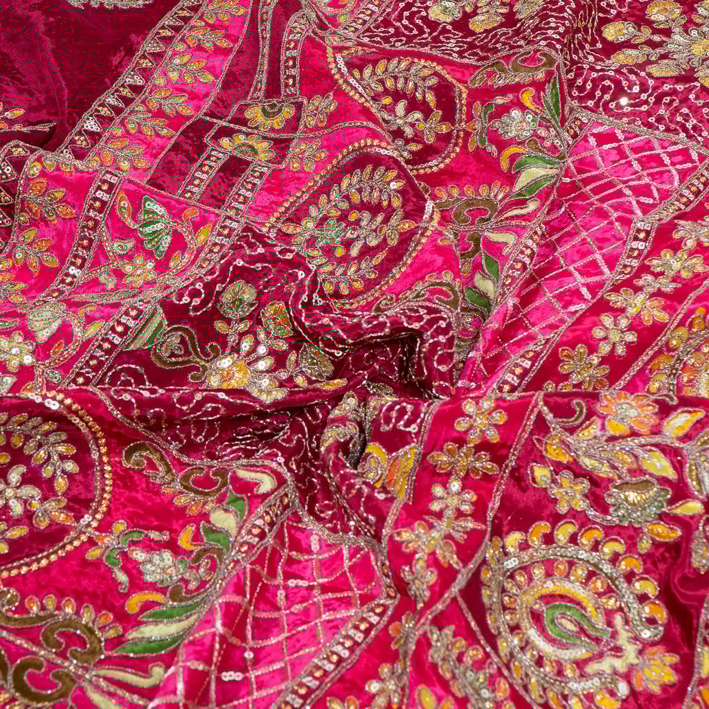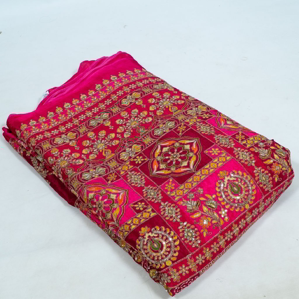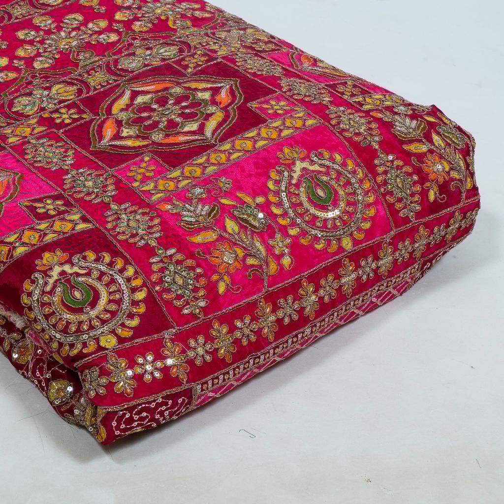 Make a spectacular entrance with our Festive Crepe Embroidered & Panelled Fabric. This material is a celebration of texture, color, and traditional craftsmanship, featuring a substantial Crepe-like base (200 GSM) that drapes beautifully despite its heavy ornamentation.