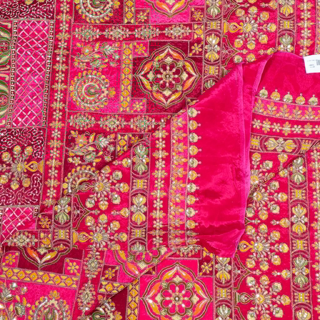The fabric showcases an intricate patchwork or panelled design filled with multi-colored thread work, rich Zari, and shimmering sequins. Each panel features a unique motif—from traditional paisleys to geometric patterns—creating a visually dynamic and luxurious look. This fabric is ready-to-stitch and ideal for creating grand, statement pieces like designer lehengas, festive gowns, or striking long jackets for weddings and major celebrations.