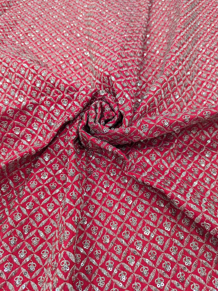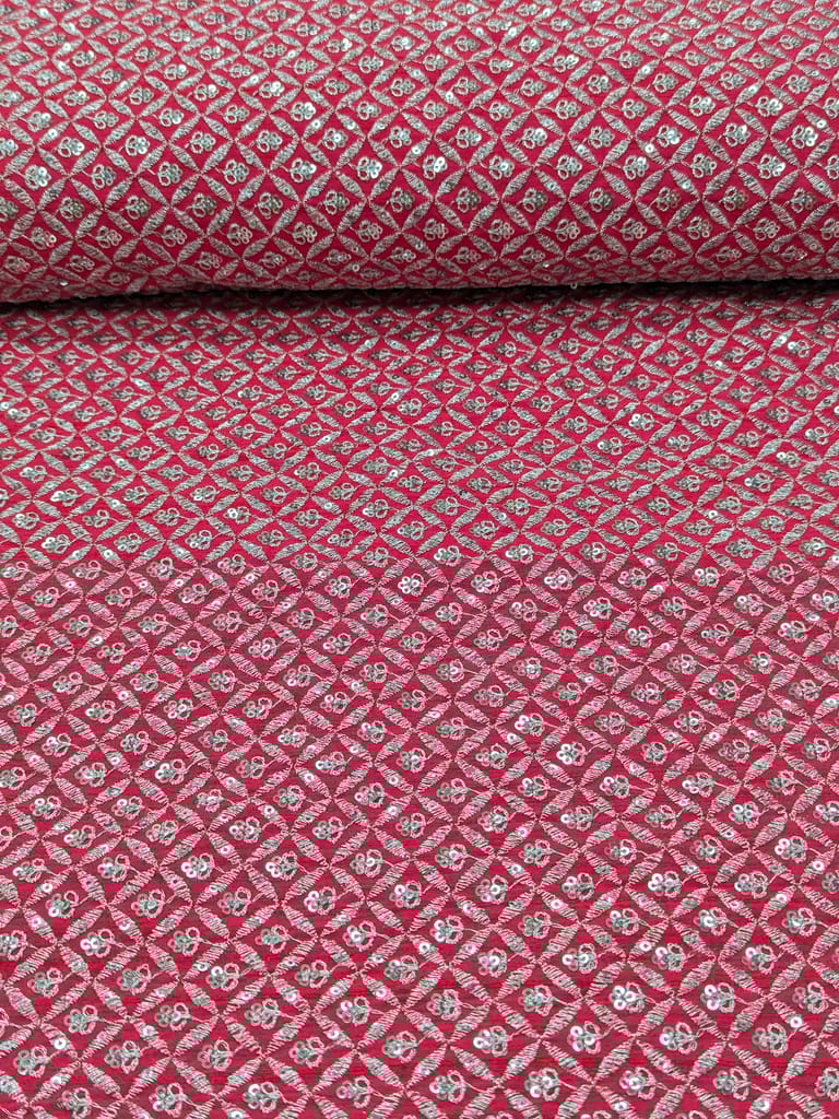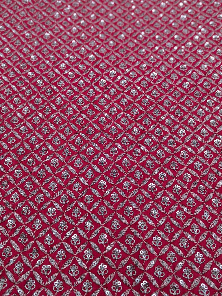 This fabric is a dark pink colored material featuring a dense, ornamental or geometric & floral pattern in a lighter, contrasting silver color sequins and zari. The intricate, interlocking design gives it a visually rich texture.