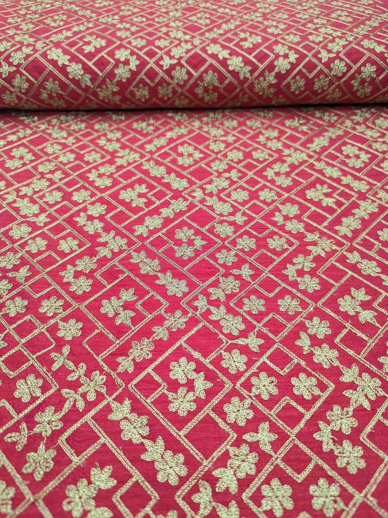 This fabric is a dark pink colored material featuring a dense, ornamental or geometric & floral pattern in a lighter, contrasting gold color zari. The intricate, interlocking design gives it a visually rich texture.