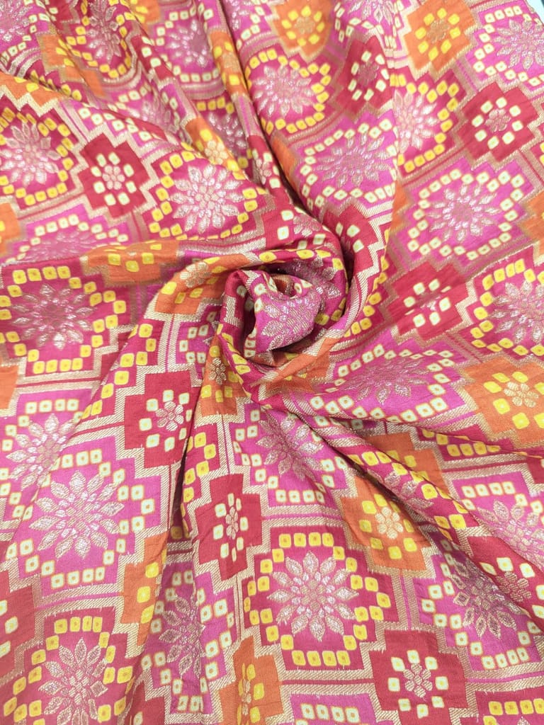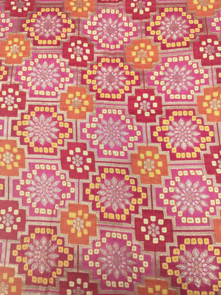 This fabric features a vibrant, traditional Indian-style geometric and floral pattern. The dominant colors are various shades of pink and red, accented with bright orange, yellow, and metallic gold or silver threads that give it a rich, shimmering appearance. The design is a woven interpretation of a traditional bandhani or jaipuri print style.Due to its opulent look and traditional design, this type of fabric is typically used for creating ethnic wear such as sarees, lehengas, salwar kameez suits, and dupattas (scarves).These garments are popular special occasions due to their rich cultural heritage and aesthetic appeal. It could also be utilized in home decor for making decorative items like cushion covers or table runners, adding a touch of vibrant, cultural flair to a space
