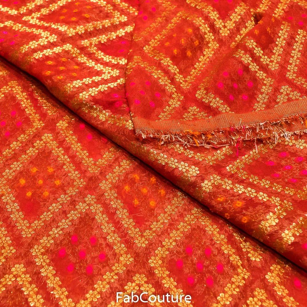 Red Colour Georgette Jacquard Jaal, SKU: 100205856B Red colour georgette jacquard in geometric pattern with pop colour detailing is an excellent fabric for lehengas, shararas and sarees as well.