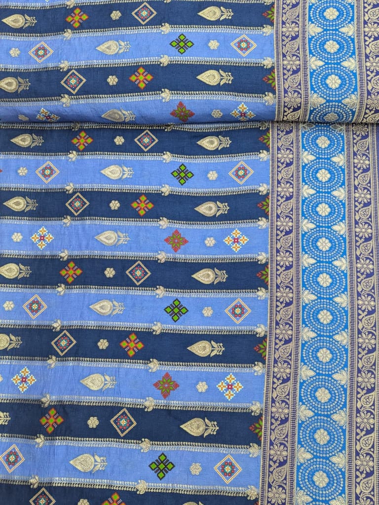 The fabric features a striking color palette dominated by various shades of blue, ranging from light sky blue to deep navy blue. These blues are arranged in vertical stripes, providing a structured background for intricate motifs. The patterns, which include tear-drop shapes, geometric diamonds, and floral designs, are woven using contrasting threads in red, green, yellow, white, and shimmering metallic (gold or silver-toned) threads that catch the light. A richly detailed border at the bottom incorporates circular and floral designs with abundant metallic threading, adding to its luxurious appearance