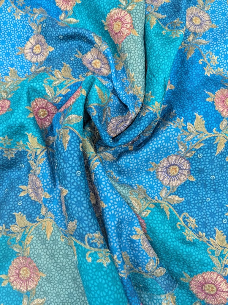 The fabric features a vibrant pattern with prominent shades of royal blue and teal colour, interspersed with embroidered floral motifs in a light blue and purple color, outlined in gold or beige thread. The background has a textured, dotted appearance, while the sections have a distinct jacquard, weave pattern.