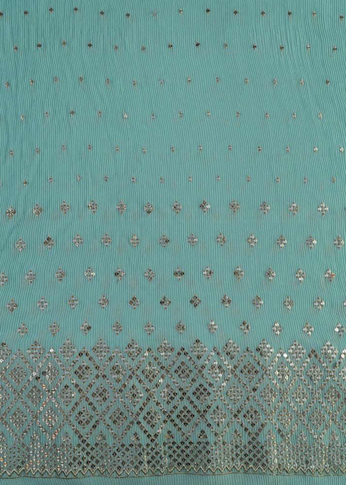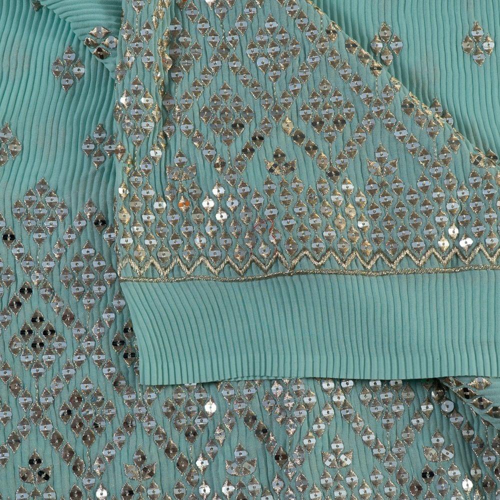 Fabcouture always tries to bring the latest trends to you, just like this pleated georgette fabric. The edit has beautiful glossy pastel shades with mirror embroidery running on the piece of clothing. The border has an alluring geometric pattern which looks accentuating. The lightweight fabric is highly durable and never goes out of fashion. You can make bridesmaid lehengas to beautiful salwar kameez to Indo-western attires. SKU : 100224825