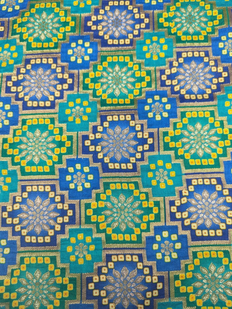 The fabric features a vibrant Bandhani tie-dye style pattern, characterized by small, tightly tied dots forming intricate geometric and floral motifs across the material. The primary colors are striking shades of blue, teal, and green, interspersed with bright yellow accents and subtle metallic gold outlines that highlight the designs.