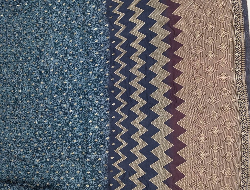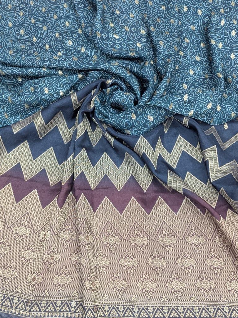 This fabric features a rich and sophisticated color palette, primarily dominated by deep shades of teal and navy blue. The design is accentuated with intricate gold-toned patterns and a striking chevron border in a lighter beige and maroon hue. The use of metallic threading and varied textures gives the material an elegant and luxurious appearance.It is ideal for creating traditional garments such as sarees, salwar suits, kurtas, or dupattas. It could also be used for more contemporary apparel like flowy dresses or skirts, or even for home decor accents such as cushion covers or table runners, where its rich colors and patterns can make a statement