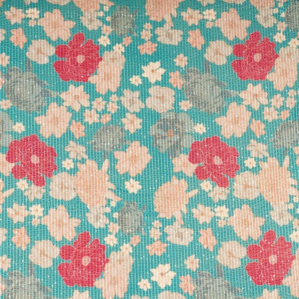 The Teal colour velvet fabric is overlaid with a repeating pattern of off-white and peach-colored smaller flowers and leaves, interspersed with larger, prominent red or coral-colored floral motifs.
