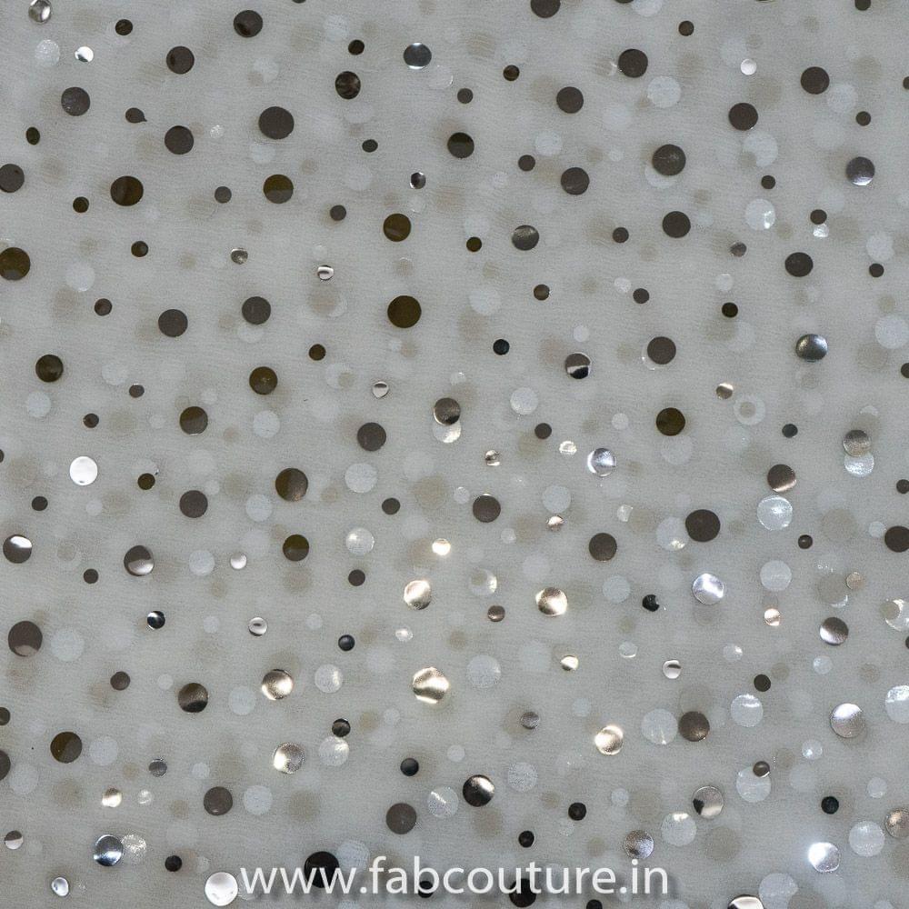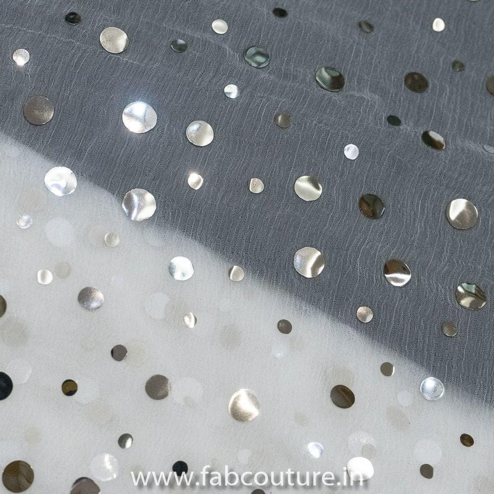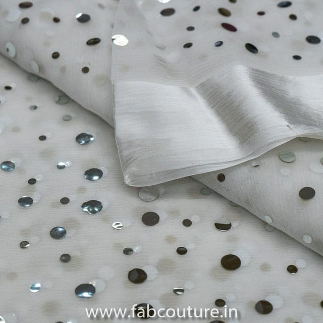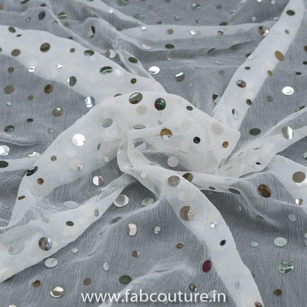 White coloured Chinon Mirror Embroidery is a beautiful fabric specially for dupattas and sarees because of its sheer nature and light feel, SKU: 100201826 CHINON MIROR EMB D.NO 37539