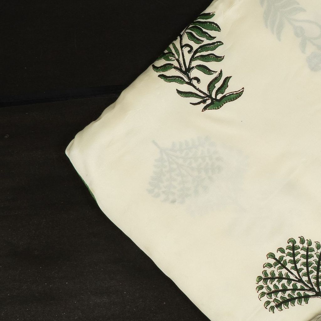 This White Modal Satin Printed Fabric features a traditional Bagh-inspired design with alternating motifs of floral bunches and stylized cypress trees, giving it a timeless ethnic charm. The smooth, glossy texture of modal satin enhances the elegance of the print, while the soft drape makes it perfect for both casual and festive wear. The classic red florals and green foliage on a crisp white base add freshness and sophistication to any outfit.