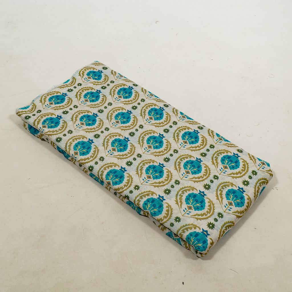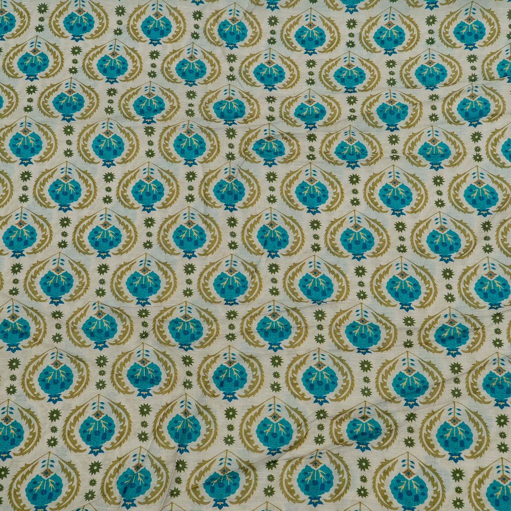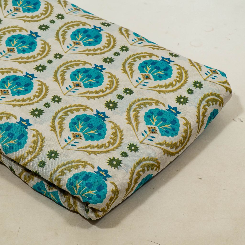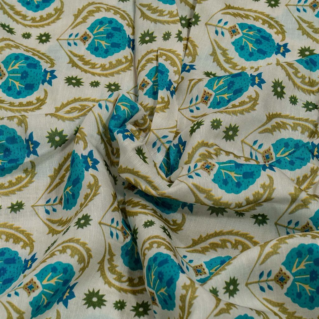 Enhance your collection with this elegant Viscose Linen Digital Printed Fabric, featuring a beautifully arranged traditional paisley-inspired butta pattern. The design showcases repeating teal motifs framed with intricate ornamental detailing, complemented by small star-like accents that add depth and rhythm to the overall composition.